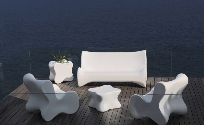 Karim Rashid,当代最耀眼, 最多杰出作品的美国设计师,为西班牙VONDOM品牌设计了50个方案的作品,最终,它们归在6个系列。在这6个系列中,最突出的是DOUX系列, 一个器官造形的,友善的,色彩奔纷的。。。手绘出来的自然形状让你想触摸它,坐在它上面,享受它。 多功能性和未来感是这个系列最突出的元素。DOUX的桌子是多功能的 - 当躺下时,它是一张桌子,在中间的位置有一个孔,可以储存东西;当站立时,它变成了一个优雅的花器或一个可以放香 槟或酒的冰桶。