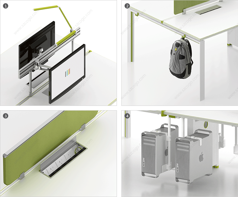 | 1、桌面屏风,多种选择:板材、玻璃、亚克力、吸音板、多功能挂槽。 | 2、超人性化设计,多功能挂件,收纳无处不在。 |