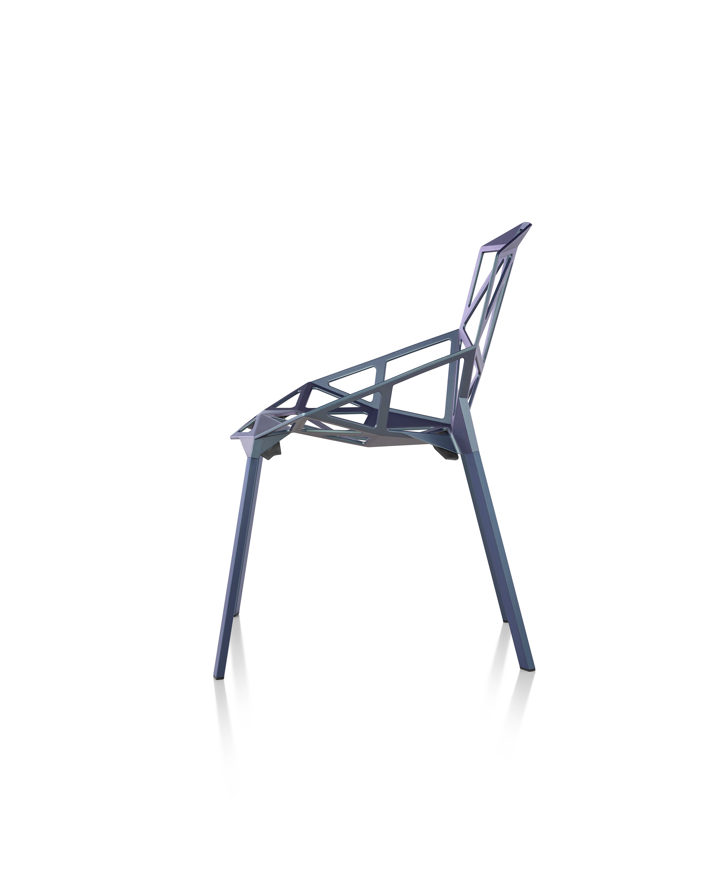 最受瞩目的德国设计师Konstantin Grcic 应邀为MAGIS 设计的Chair One(几何吧椅),是设计生涯中最具有标志的产品之一。办公椅体为模铸铝合金结构,经过氟化钛镀膜与塑料粉末涂布。椅子具有阻燃性、抗腐蚀性。适合室内及室外使用。以铝金属与钛金属制成的 Chair One,以多个平面以不同角度组合而成,建立起立体的外型。多个中空的三角型组合而成的座椅,不但令为用家带来强而有力的承托结构,而且还能在简单设计之中带出不一样的风格。这把椅子的惊人形象难免使人对它的舒适度产生疑问,但当你真正坐于其上,你会发现它实际上非常舒适,那些稀疏的网状结构能够极好地支撑不同体型的人体,后背上的把手也非常实用。当你知道Chair-One最初是被当作户外用椅而设计的,你会更加佩服Konstantin Grcic的缜密用心:极少的表面可以杜绝雨水,并且减少灰尘堆积,夸张的形态则令它能够在街道、建筑或自然的环境中拥有自己美学上的存在,而不是被环境所吞没。Konstantin Grcic花了三年时间设计Chair One,自2003年诞生以来,堪称Grcic精简主义风格的代表作。2006年,Chiar One为Konstantin Grcic赢得了德国政府的设计大奖。