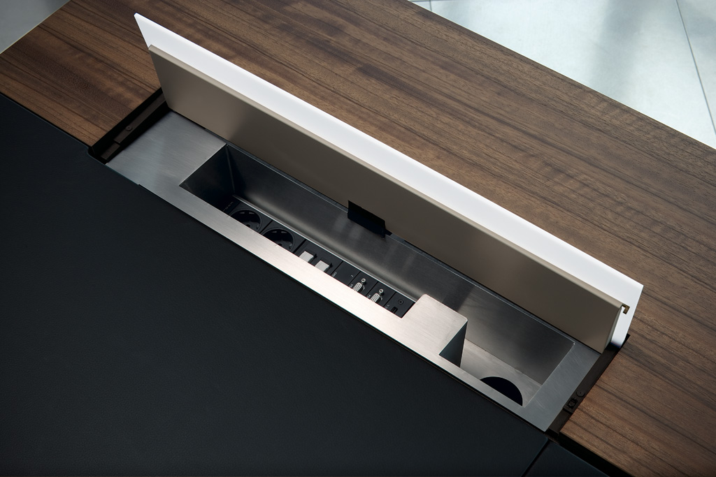这是EOOS的新总部和会议项目设计团队对该产品强大的美学诉求,比例和维度在优雅的材料的相互作用下给人深刻的印象。在几何基础上,材料的拼贴形成了它的气场。海洋胡桃木饰面可以给你和你的客人带来一种很好的体验;扶手处采用精美的皮革覆盖。由Corian制成的白色方块盖住了集成线盒,看不见的触点是打开的关键。每个设备的连接器都在方块之下,所有的电缆都隐藏在侧板和桌子上,衔接到各种设备。在工作台表面的旁边,一个隐藏的抽屉,里面可以收纳你日常所需的小物件。