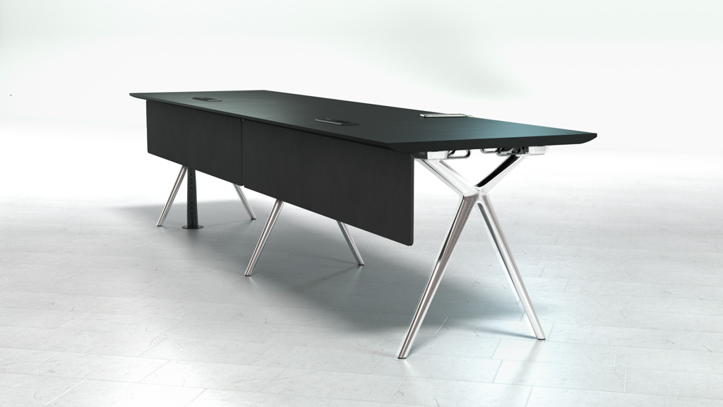这款Conference-X最大的亮点就是:桌子腿是可以将两个桌面一起快速而轻松地结合在一起,而不需要借助任何工具。而这个专利技术的的连接关键是:桌子腿顶部处在固定锁,桌底有锁扣,以此保证绝对安全和稳定。这也很好的解决了会议台的多样性:从个人的工作桌到成排的会议桌,桌子形状、大小、都可以通过脚架来进行拼接.