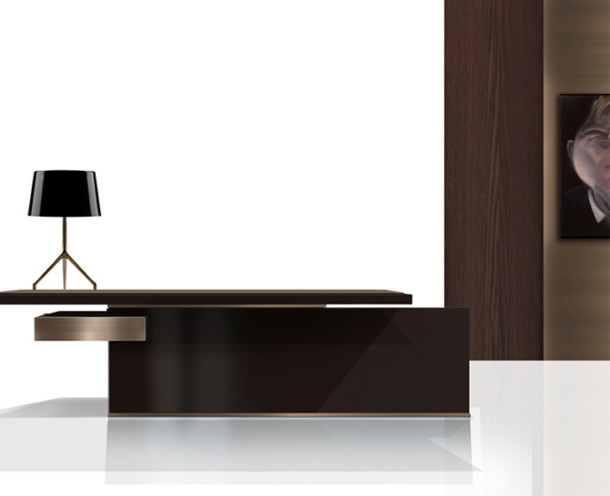 由于其金属核心结构,轻薄和加固的50毫米厚度桌面桌。工作桌面区域采用Techno Leather软垫。50mm结构前板在底部用不锈钢板完成。集成桌面电缆管理。(需要说明的是,桌面机翼在右侧或左侧,相对于工作桌面位置)