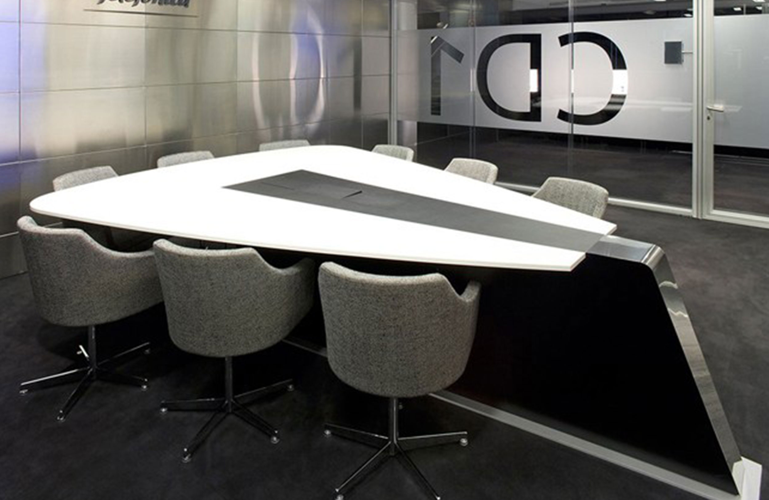 会议桌。水滴形顶部。它较窄的一端可能会召回一艘船的船。顶部分为三个平行区域,允许不同材料和饰面的组合。50mm厚的顶部由两部分组成:盖子和45o斜面底盖。表目的设计是进行预测,演示和多媒体会议。可选的集成伸缩式计算机监控系统,电缆管理和其他电子部件。倾斜的棱柱形底座由金属结构制成,金属结构固定在金属板上,并用可拆卸的面板封闭,可以方便地进入桌子内部,以便进行电缆管理和维护。表面处理:混合成品顶部采用木材,微纹理漆或Techno Leather软垫。以漆面为基础。