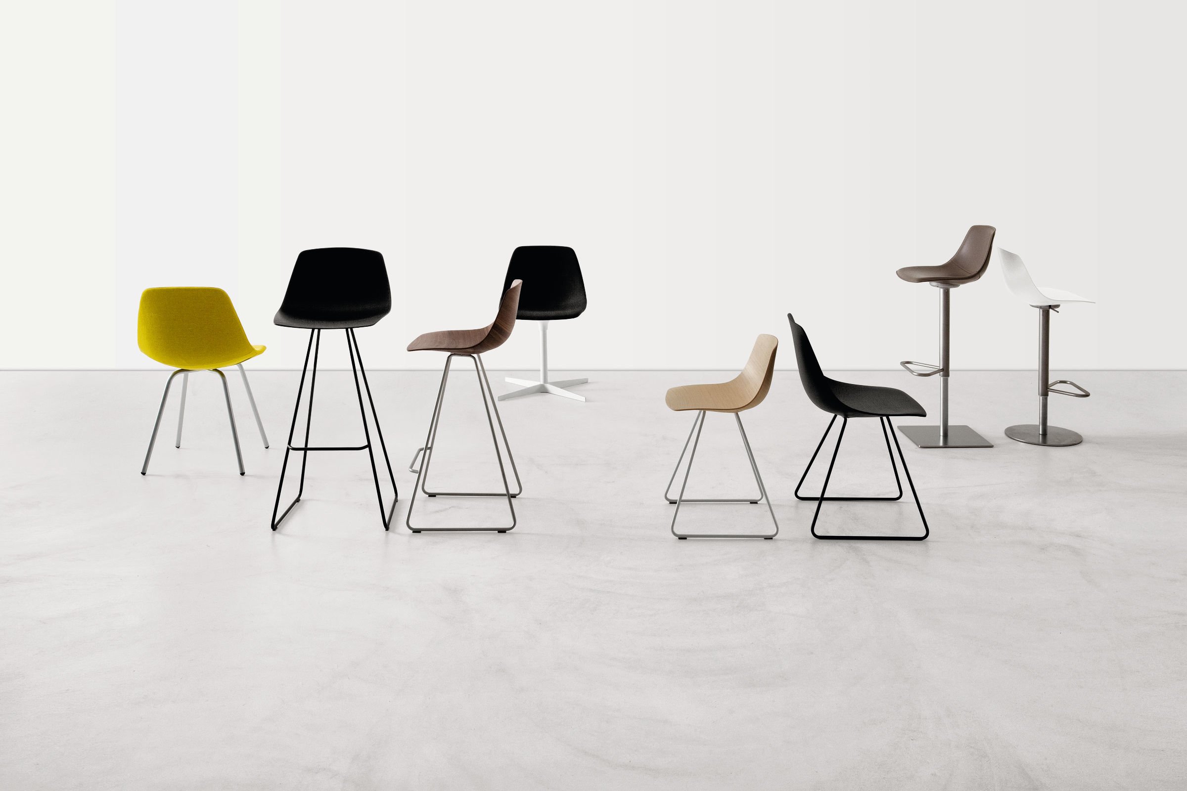 外壳由模压复合材料制成,并带有各种饰面的3D饰面板,或用皮革或织物装饰。框架带有中央支柱和交叉底座,四腿或雪橇框架,亚光镀铬或黑色或白色。凳子可提供与椅子版本相同或带有皮革覆盖的座套。它的高度可调或固定高度可用,立柱由喷砂不锈钢制成,镀锌底板覆盖有不锈钢板。