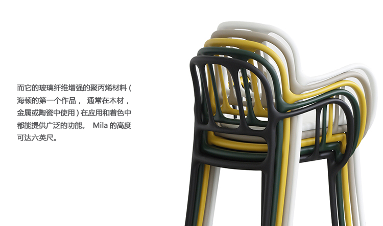 西班牙艺术设计师Jaime Hayon使用空气成型技术来实现Magis Mila椅子的弯曲形状。它的动态的,手势线条让人想起加泰罗尼亚现代主义的影响,而它的玻璃纤维增强聚丙烯材料(这是Hayon的第一个,他通常在木材、金属或陶瓷上工作)在应用和着色方面都具有通用性。Mila的高度可达六英尺。