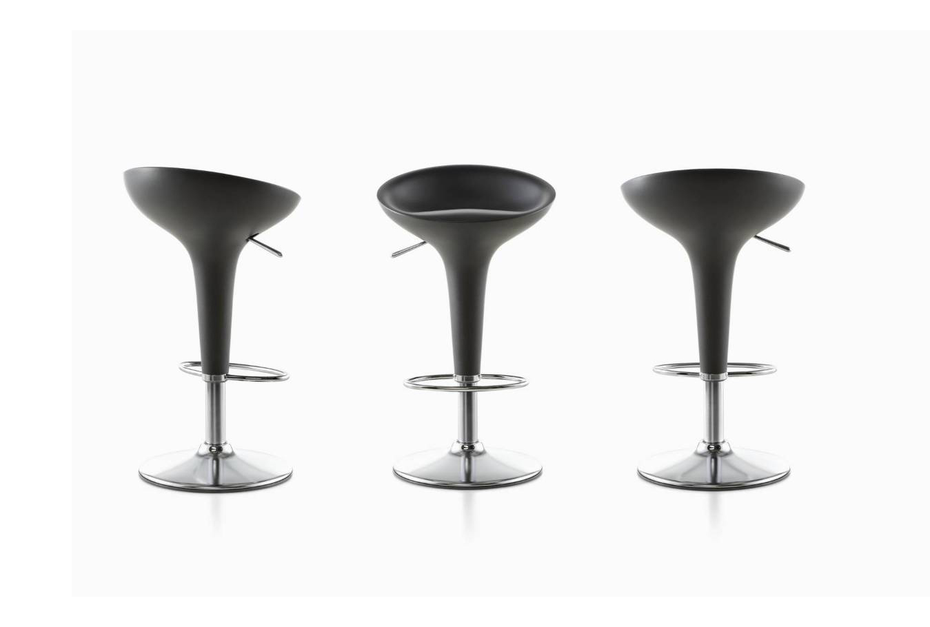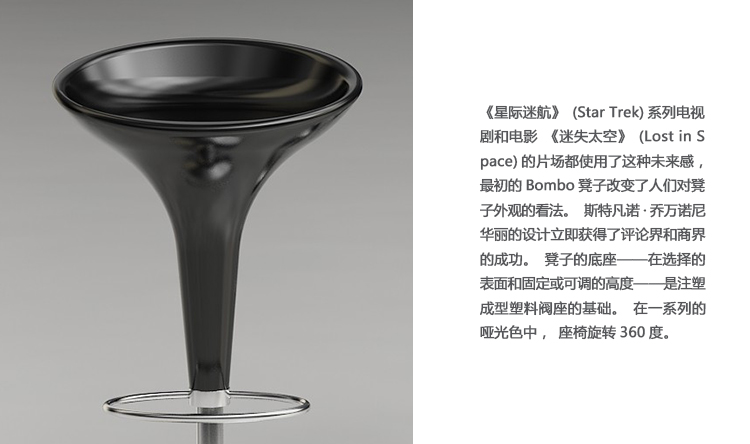《星际迷航》(Star Trek)系列电视剧和电影《迷失太空》(Lost in Space)的片场都使用了这种未来感,最初的Bombo凳子改变了人们对凳子外观的看法。Stefano Giovannoni的华丽设计立即获得了评论界和商业上的成功。可提供一系列哑光色,座位旋转360度。