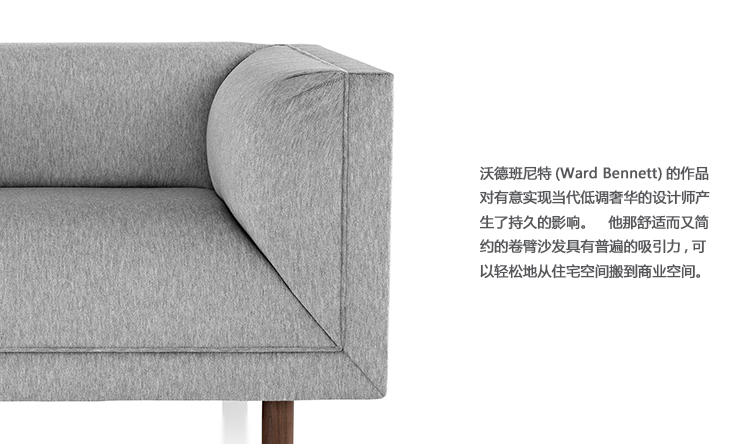Ward Bennett的作品对追求现代低调奢华的设计师具有深远的影响。他设计的Rolled Arm沙发典雅而又简约,散发出迷人魅力,并可轻松满足家居和商用空间的需求。宽大的矮腿设计具有建筑上的层次感,利落的斜接软垫打造了优雅廓形。Rolled Arm架在凹陷的硬木腿上,以胡桃木或白蜡木精制而成,共有三种沙发尺寸,亦有俱乐部椅款式。