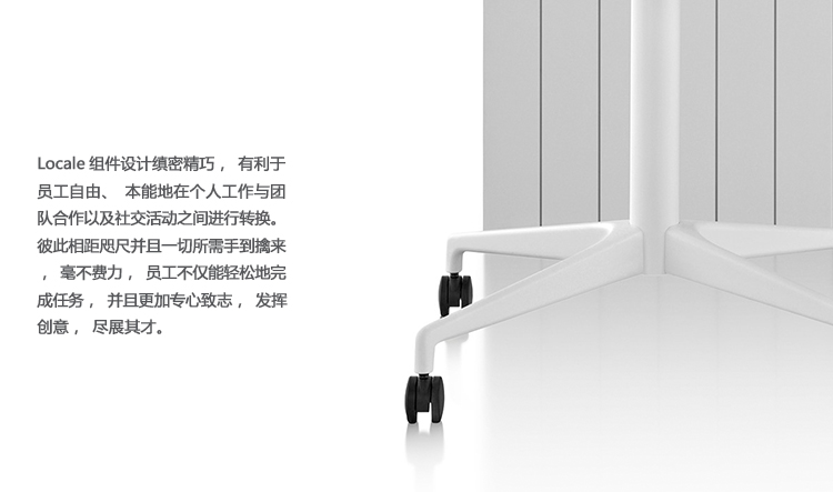 Locale能帮助机构利用和管理开放式的办公空间,通过该系统,员工能在坐姿或站姿,或是在团队工作与单独工作状态之间,实现无缝转换。Locale消除了视觉和实体障碍,并将整个开放式工作空间的建筑格局压缩成紧密联接的相邻结构,有助于员工更得心应手地工作,并保持彼此沟通顺畅。