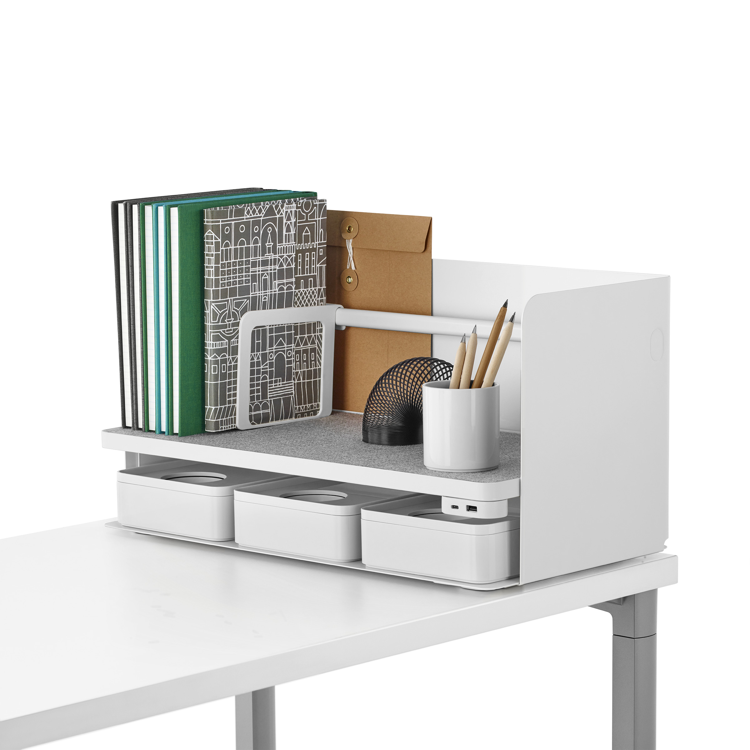 考虑到占据家庭及办公室空间的笨重物品的存放问题,Sam Hecht和Kim Colin设计了具有可拆卸盖子的储物盒。每个盖子上设计有孔洞,可供放置移动式笔筒。或者,笔筒可固定于储物盒内部孔洞下方压槽中,从而在无需打开盖子的情况下便可接触杯中物品。