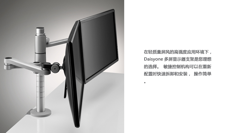 Daisyone多显示器臂非常适合具有轻质屏幕的高密度环境。 当您准备好重新配置时,快速释放控制使安装和移除变得快速而简单。