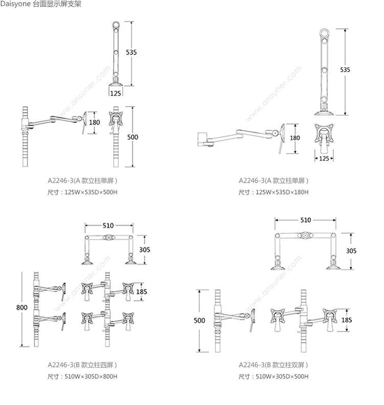 Daisyone 台面显示屏支架 系列尺寸/示意图