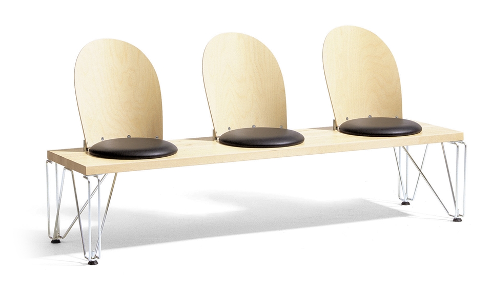 伯格·林道· 约翰·林道(Börge Lindau, Johan Lindau)共同设计GATE,门是公共区域的可链接长凳系统。长凳有两个笔直和两个弯曲基本单元可用。使用门基本单元形成直行,弯曲或直角的行以适合其设置。可以根据需要配备靠背和/或座椅。座椅:圆形或直形软垫。靠背:圆形,直形,整体软垫。台式胶合实心桦木厚40毫米。镀锌钢框架。皮革或织物覆盖的软垫座椅。阻燃聚醚泡沫塑料内饰。压缩桦木靠背。座椅高度420 mm,总高度890 mm(含靠背),总深度460 mm,座椅Ø。 390毫米,CC座650毫米,长度,2座1200毫米,长度,3座1800毫米,圆形,1,5座45°,圆形,2座60°。