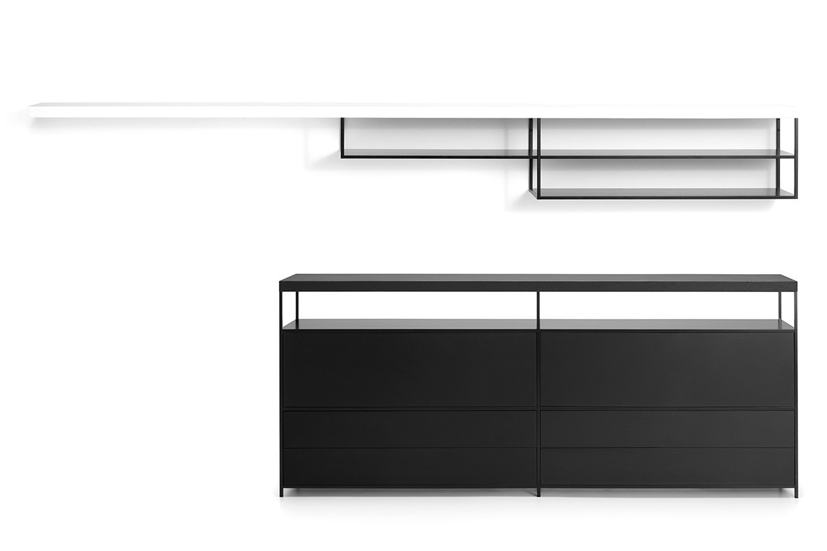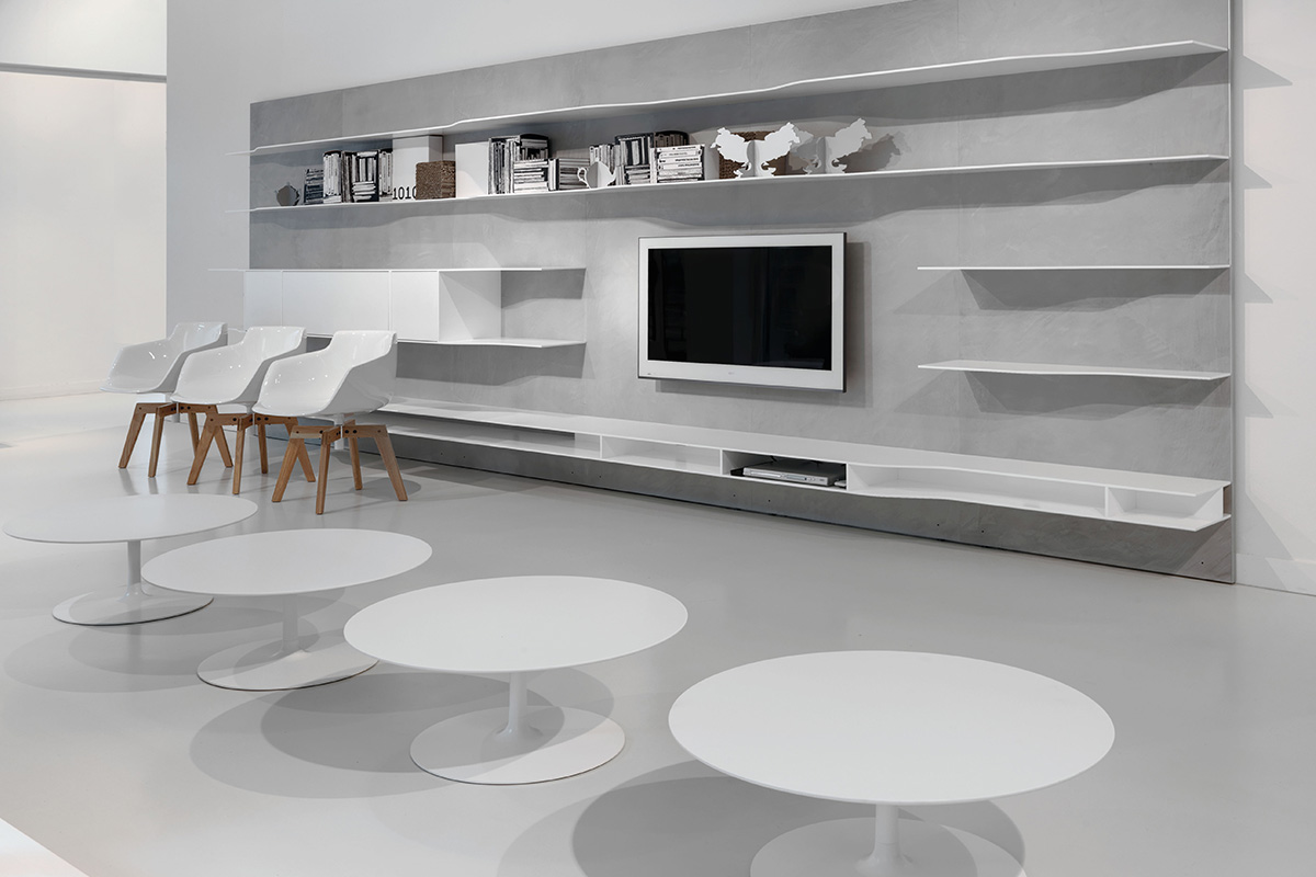 波浪壁系统,它允许开发不同的组合物,其是更受限制和稀有版,因此与少数元素使得系统更横向的房子内的非结构化版本。 视觉和功能特征保持不变,保持在设计和动态性质。原产品 搁架单元 货架由白色丙烯酸类固体表面的,厚9毫米。 一些搁板设有通过一个曲折的和精巧的设计连接深度(35/25 anD25 / 15厘米)的改变。 尺寸和类型: •L90和L180 cm矩形搁架单元,深15、25或35 cm •L90 cm前置式(左和右)搁架单元,深度可变,15/25 anD35 / 25 cm。 •L180厘米亲LED(左和右)搁置单位可变深度,35/25厘米。 •L180厘米亲率领搁架单元具有可变深度,25/35/25厘米。 他们也都在ELECTRI版版本:2个搁架单元(11.8厘米高),配备有用于电缆通道和隐藏后方的空腔。 在搁板的上部部分中,您ND对于由所述搁架的相同的材料制成的电缆管理的开口,以使向每一个可能的器具电缆出口尺寸和类型: •L180厘米亲导致ELECTRI编搁架单元具有可变深度25/35/25厘米 •L180厘米矩形ELECTRI ED搁架单元35厘米深。 可选管道,总是安装在牢固的表面上,以便在电视单元壁挂式安装时隐藏电缆。