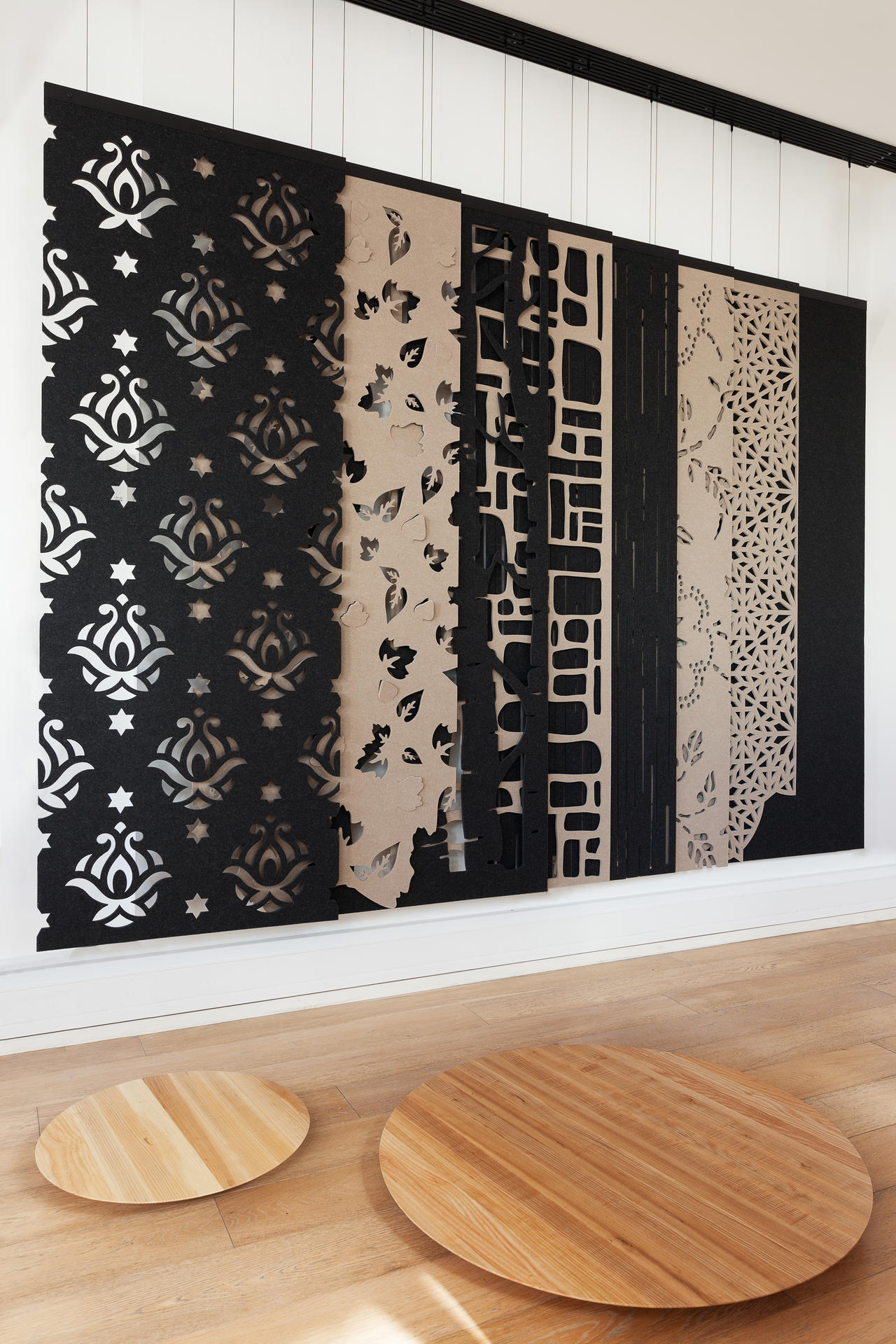 通过这种浮动的装饰面板集合创造一个隐私层,这些面板提供具有声学优势的艺术风格。它们将有助于减少声音的传递,并减轻诸如铃声之类的高音以及键入和点击的声音。它是一种优雅的元素,可将房间划分为一体。这些吸音板由双层BuzziFelt制成,采用大胆的图案进行精确切割,并具有一系列亲生物和几何图案。 您可以选择将BuzziFalls安装在墙壁或天花板上还是悬挂在上面。BuzziFalls Rail是另一种选择,它可使面板轻松滑动-创建可移动的房间隔板,从私人空间转移到公共空间。 面板在一条三米长的轨道上运行,面板从左向右滑动。通过为导轨安装两层平行轨道来创建滑动门的效果。 使用可用的新材料选项BuzziFelt Printed将BuzziFalls提升到一个新的水平 。如果您无法决定自己的喜好,请从10张照片中进行选择,并选择一张或两张照片的组合来选择不同的外观。 吸音毛毡结构可确保从正面到背面都具有充分的声学性能。它减轻了区域之间的声音传递,并吸收了高频音调,例如同事的颤音,敲打声或铃声,这使其成为开放空间中的理想空间分隔器。