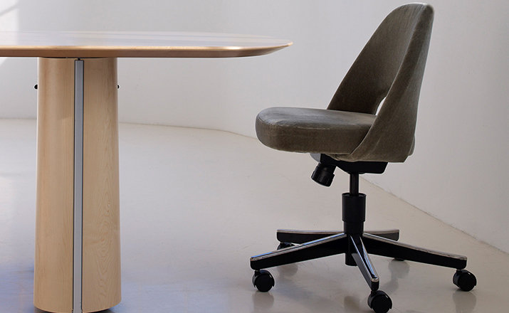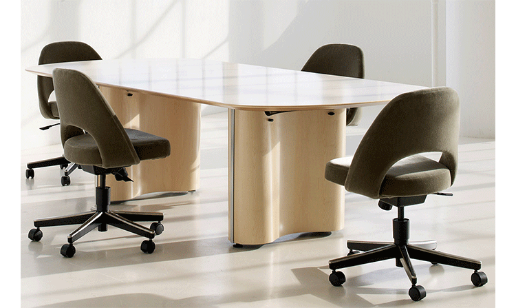 In his groundbreaking collection of 1957,Eero Saarinen transformed executive seating into a fluid,sculptural form.Recognizing the importance of user comfort,Saarinen became the first to construct a chair shell from fiberglass,a pliable material that flexes the In response to body weight. The chair is available with and without very different,and the features metal or wood legs,or a swivel base.The armless chair with a plastic back, ideal for cafe applicatons,is a recent reintroduction.