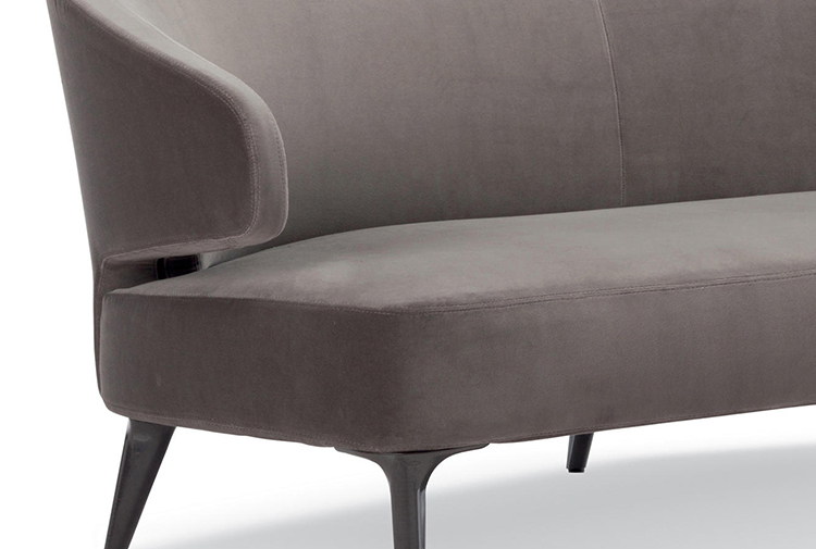 沙发的围裹式靠背特色十足,扶手线条与之完美呼应,以蓝灰色调呈现的压铸铝合金支脚尽展精致设计之美。