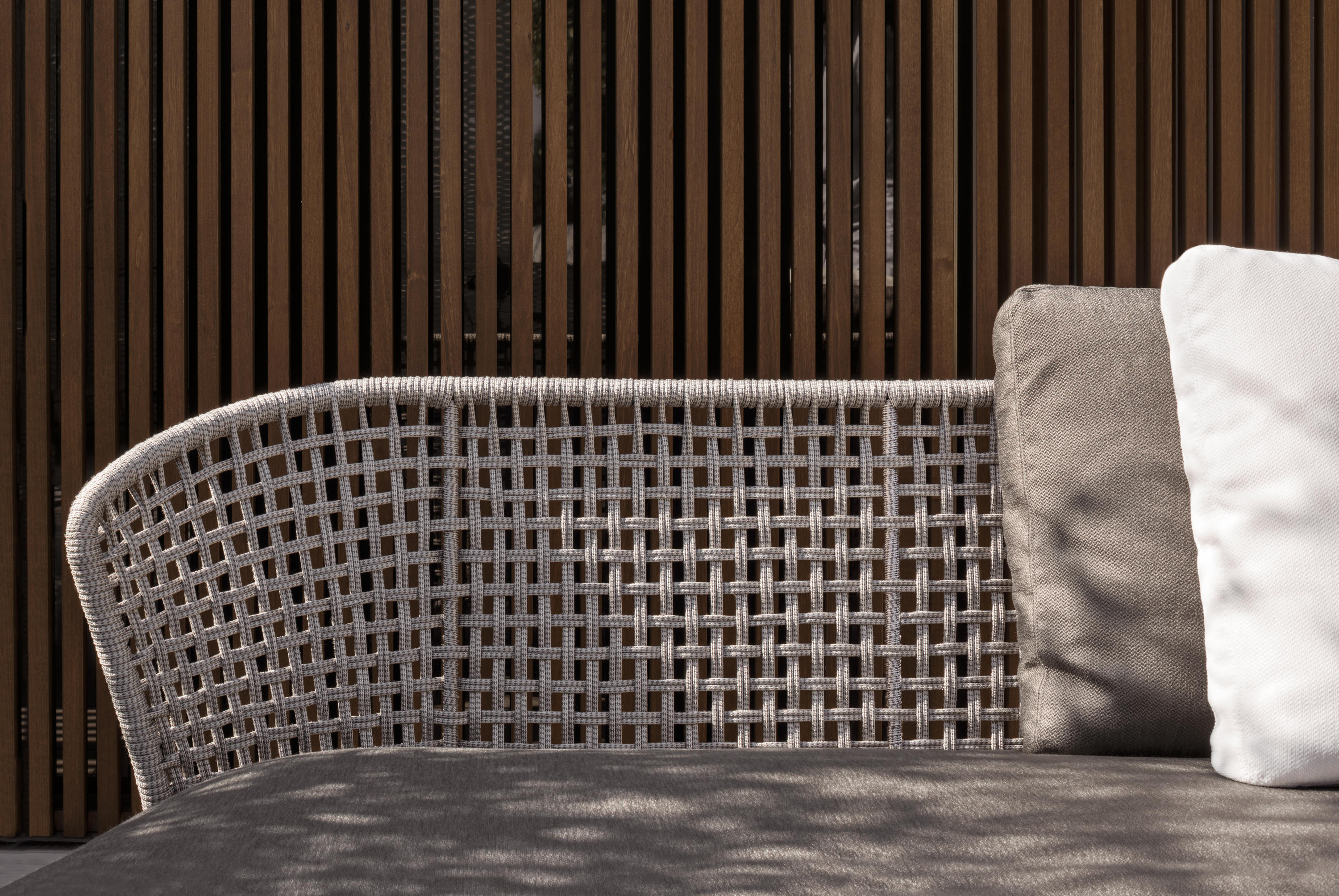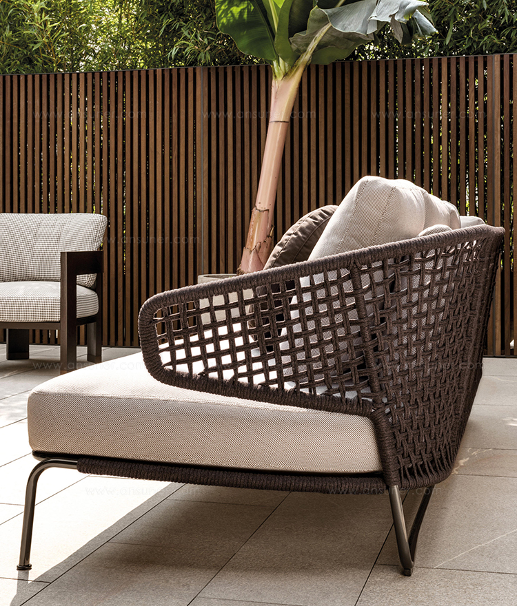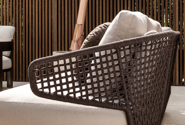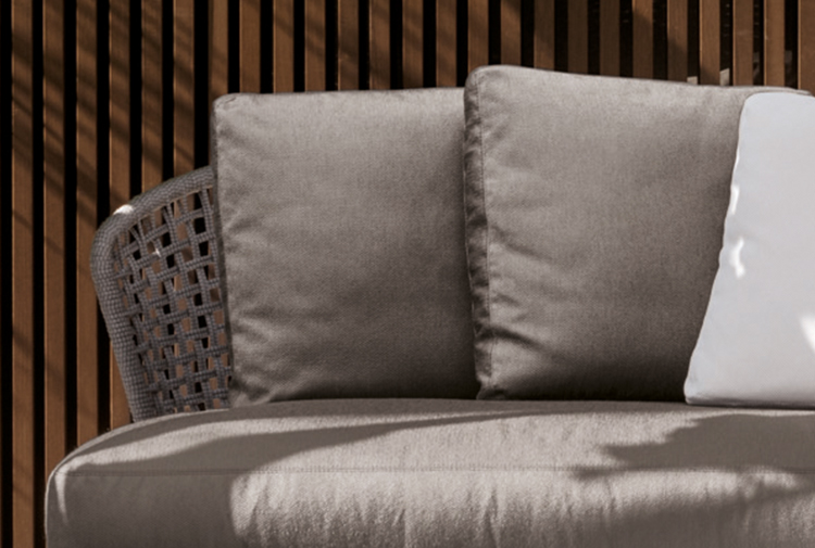 Aston是一个单品家族系列,其中包括沙发、沙发床、扶手椅、脚凳、座椅,为家居环境和“共享空间”提供优雅而时尚的装饰,在室内和室外皆可应对自如。阿斯顿“绳”户外系列采用金属材质的构架,搭配Pewter色聚酯漆面,部件都针对户外环境而经过特别处理,覆面采用疏水性纤维面料。靠背采用直径为7毫米的特殊聚丙烯纱线编织而成,两种颜色可供选择:浅灰色和深棕色,与全新Art Lifescape 02系列的面料和Alison “Dark Brown”户外系列的色调相得益彰。针对户外环境的特点,金属构架经过特别处理,搭配Pewter色聚酯漆面,覆面采用特殊聚丙烯纱线编织而成,有两种颜色可供选择:浅灰色和深棕色。坐垫采用Minotti Studio独家设计并通过激光加工而成的几何装饰。靠垫的内部填充物是高弹性聚氨酯泡沫,覆面采用疏水性纤维面料。