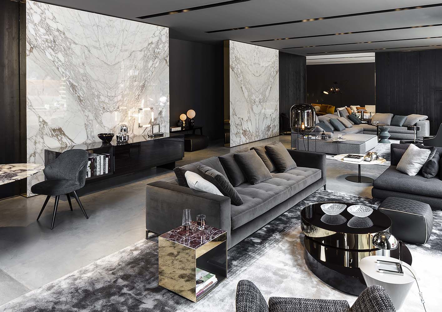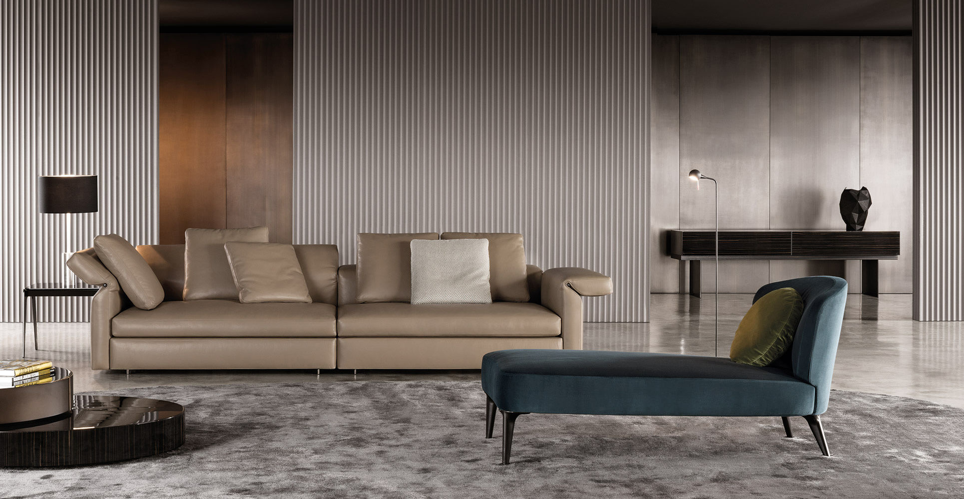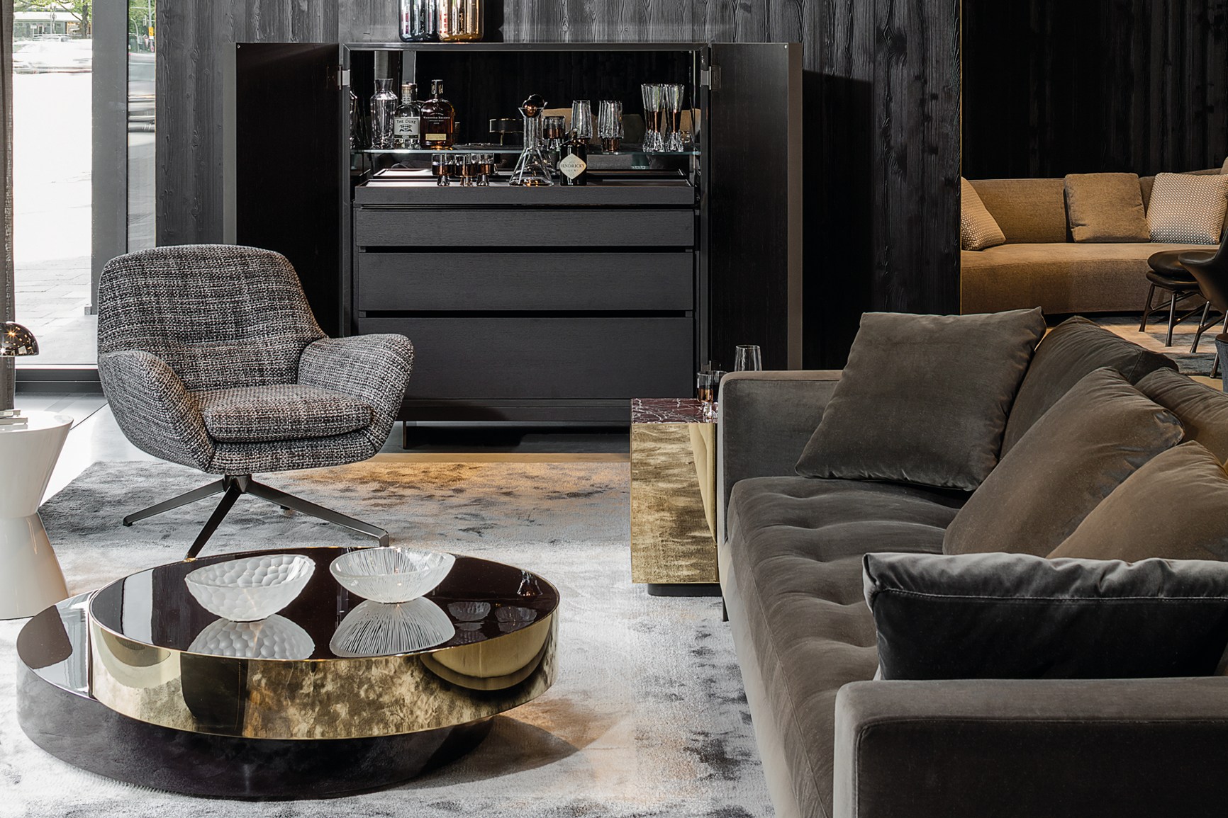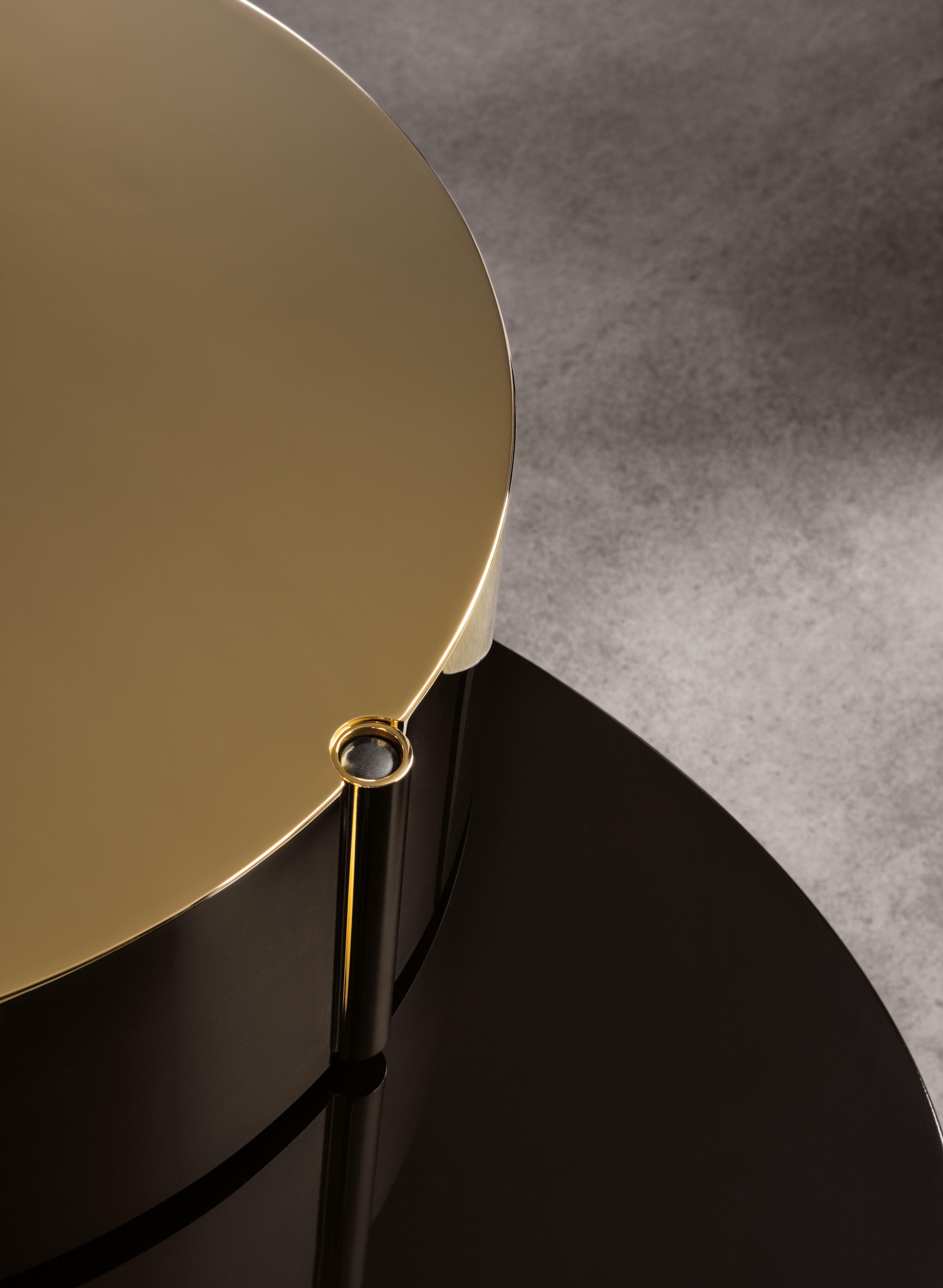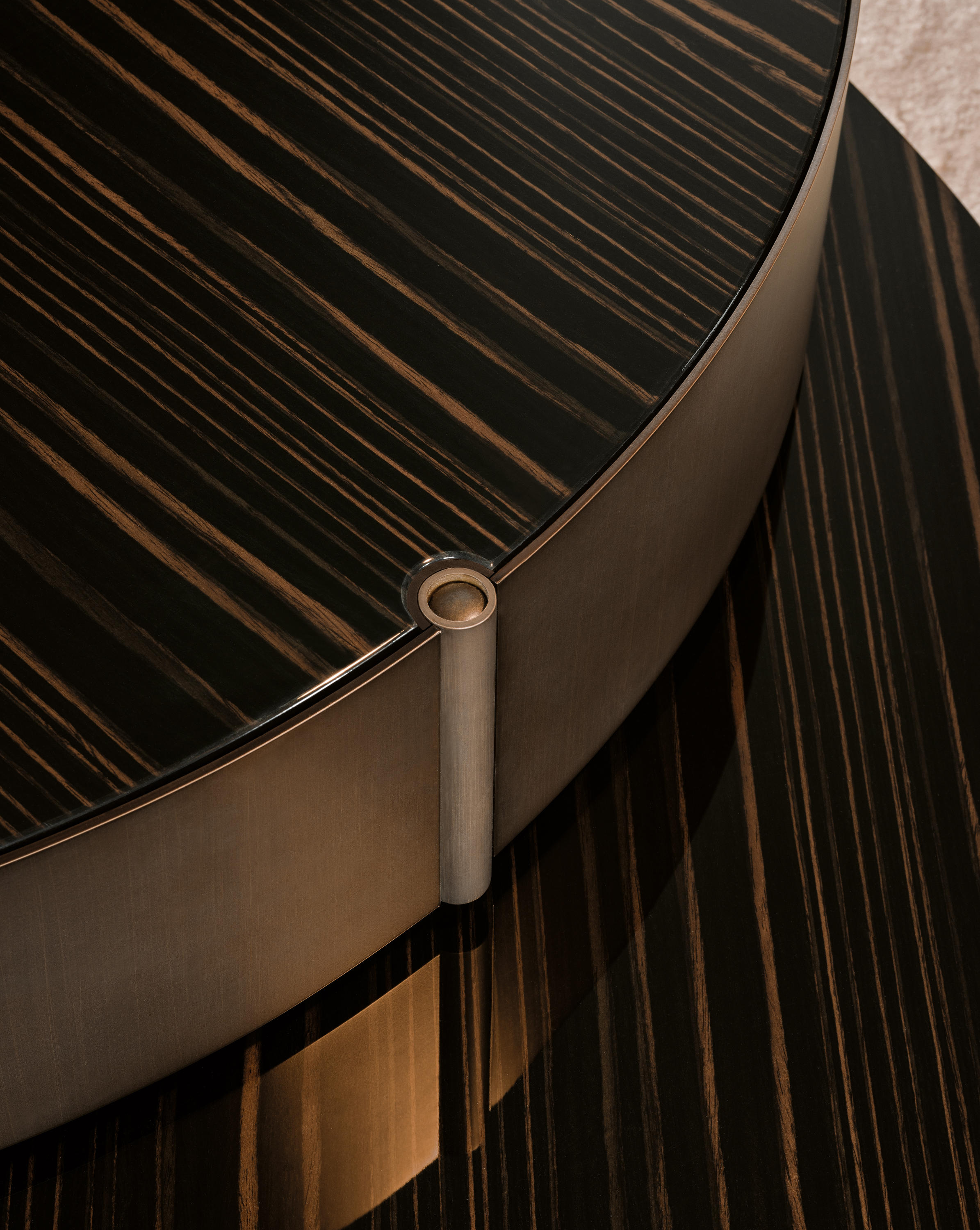 重叠的造型搭配珍贵的材质,这就是Benson的独特之处。木材的质感和金属的光亮感完美展现出雕塑般的造型。Benson边几可以直接放置在地面上,有两种不同的尺寸可供选择,以满足不同的功能需求。尺寸为120x95厘米的版本,基座为椭圆形,上方面板为圆形,配备的机械装置可以使其旋转360度,增强边几的延展性,使其更加靠近沙发座椅。直径为46厘米,高度为38厘米的版本,专门用于放置在沙发和扶手椅的侧方,有以下组合可供选择:一种是下方台面为亮面乌木,上方台面为亚光铜色板材;另一种是下方台面为Moka色亮光漆,上方台面为金色亮光漆。