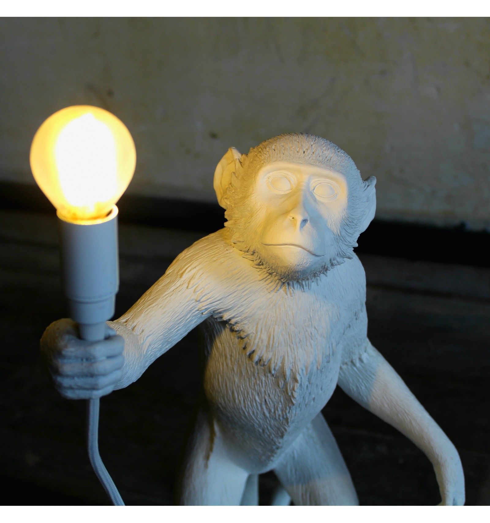 这款猴灯由树脂制成,手工完成,描绘了一只猴子在三个不同的位置,一边抓着一个LED灯泡,一边探索周围的环境,一种新的、替代的照明方式。