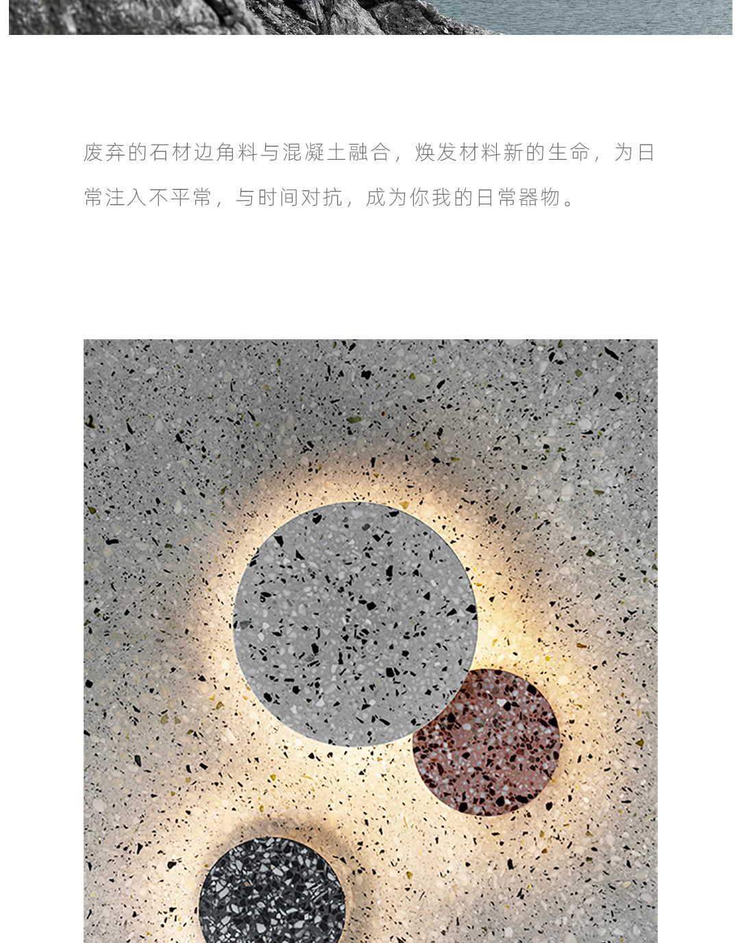 以材质再生为基本手段的水磨石系列,将陶瓷废渣再生成简洁形态的日常性家具,以衍生产业的形式回归到大众层面的使用中。 中国佛山,这片拥有全球最大最成熟的陶瓷产业链和产业集群的建筑陶瓷工厂的土地,承载着每年400万吨陶瓷废弃物带来的环境污染。 以材质再生融入日常,不仅是激发商业价值的大胆尝试,是环保理念的日常化实践,更是对自我尊严的基本坚守和追求,我们探寻陶瓷跨越地域局限的一种当代突破!
