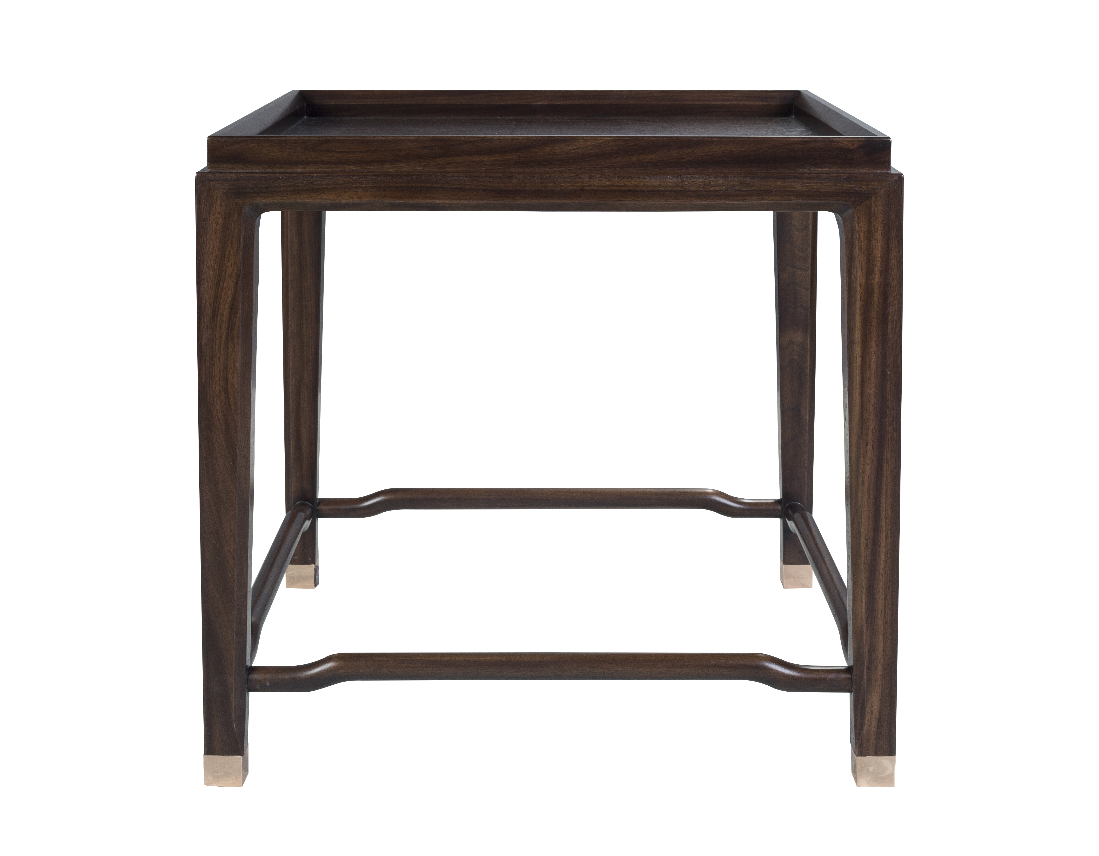 1.茶几整体简洁干练,茶几面四周向上凸出,可防止物品滑落。 2.茶几腿部采用明式家具经典构件罗锅枨,超逸空灵。 3.铜脚设计,赋予中式韵味的同时以防磨损。