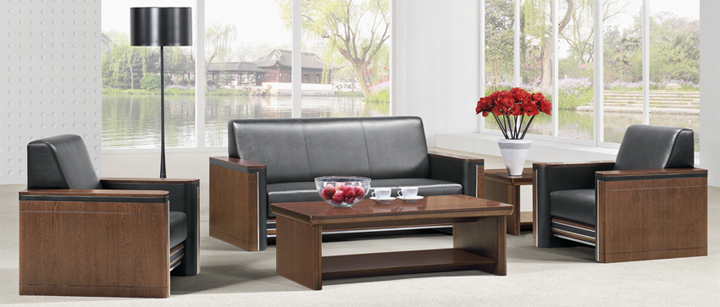 ※ 上图为办公室同系列配套沙发和茶几,实木颜色多种选择也可与职员台的木皮颜色一致,皮质颜色可根据使用单位需求进行订做。