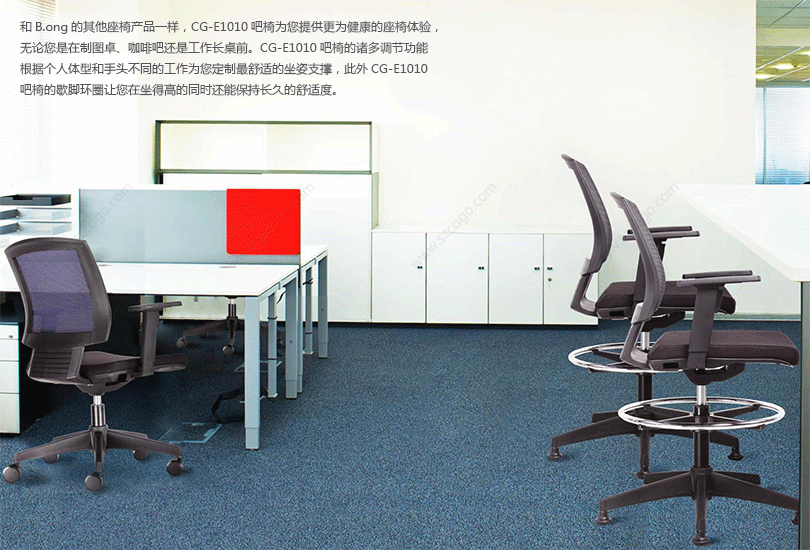 作为一款“入门级”价格的高脚椅,CG-E1010吧椅拥有非常高的性价比,它能在各种任务情景中为个人用户提供卓越的舒适度和支撑度。它能轻便地滑入合作空间和各个角落,优化可用空间,为新的工作方式和非正式的会议或互动提供支持。CG-E1010吧椅拥有旋转、向后倾靠、调节简便等卓越的功能性,能满足每个人不同的需要——包括方便地调节高度、控制靠背。