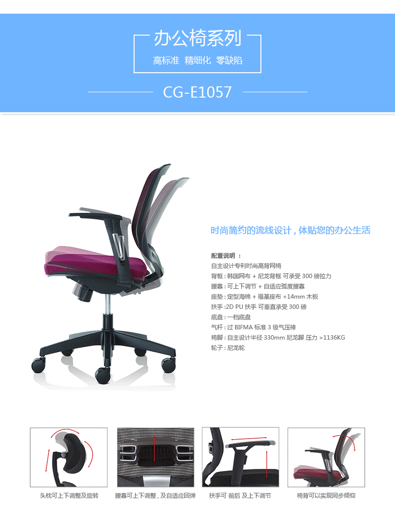 CG-E1057办公椅是一款符合人体工学的全功能性办公椅,力求使用者能充分理解其人性化的设计及达到最舒适的调节。