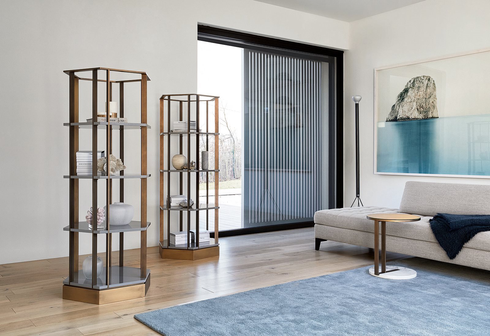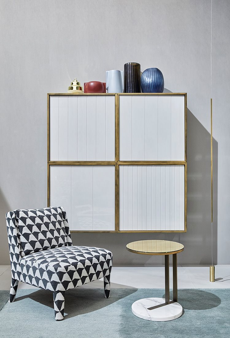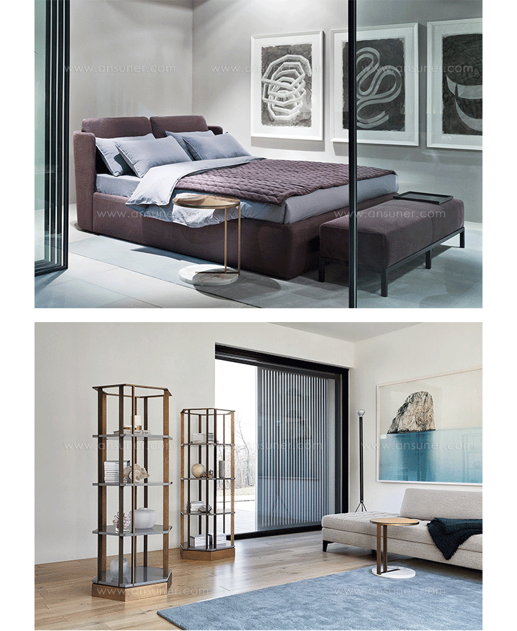 各种大理石茶几与基岩层或饰面漆木、青铜镜。