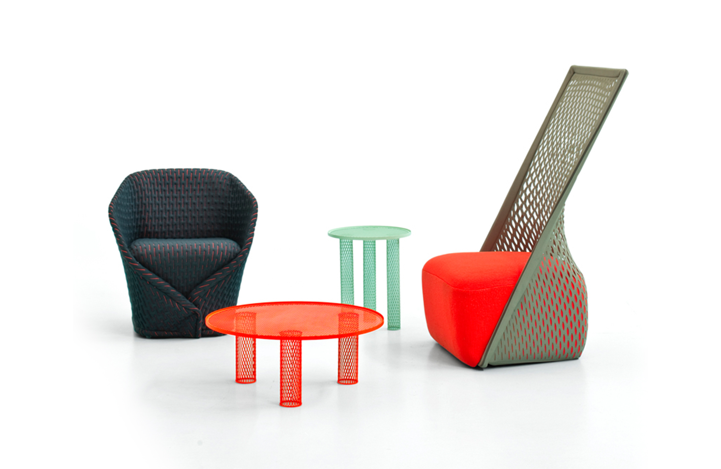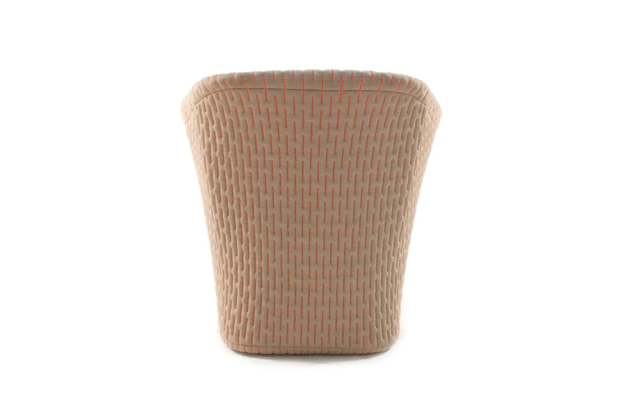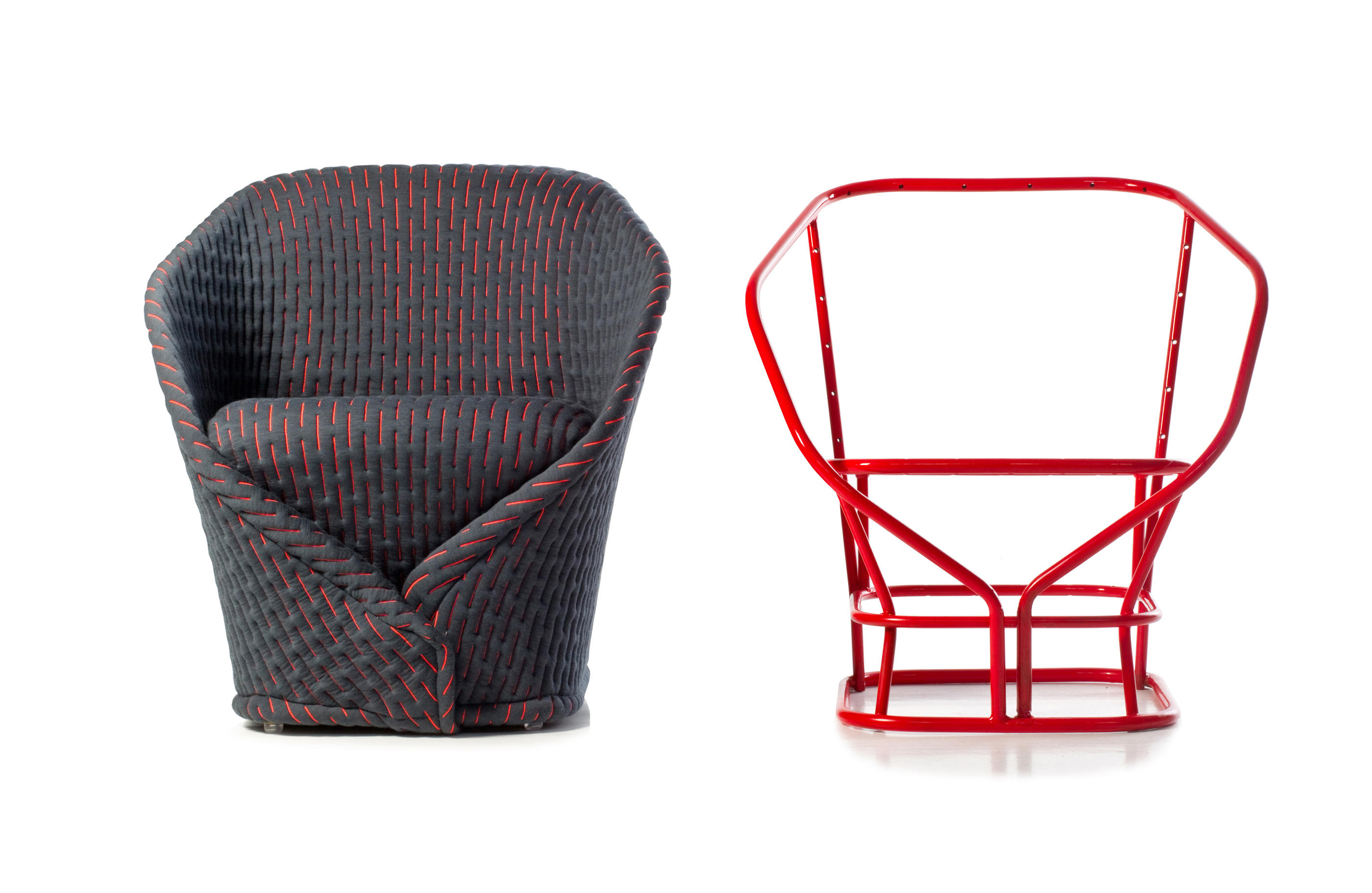 伪装成休闲椅的扶手椅,用他们的外表来控制空间。这主意很简单,用一件有衬垫的大衣盖住金属框架然后把它变成别的东西。一种非常直立的姿势,扶手的形状让人联想到双排扣外套的翻领,而这种相似之处就在中央扣扣上。室内装潢变成了衣服,可以在不过度的情况下,将赤裸的身体转变成一种追求自身内在同一性的物体。