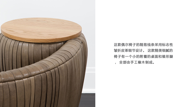 这款椅子的精致线条采用标志性皱折皮革细节设计。 这款精美细腻的椅子有一个小的附着的桌面和锥形腿,全部由手工橡木制成。
