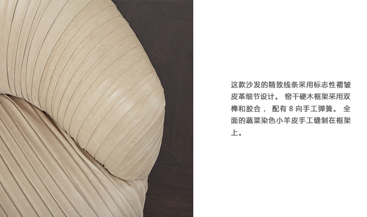 这款沙发的精致线条采用标志性褶皱皮革细节设计。 窑干硬木框架采用双榫和胶合,配有8向手工弹簧。 全面的蔬菜染色小羊皮手工缝制在框架上。 这款精致细腻的豪华沙发坐落在坚固的青铜铸造的锥形腿上。 完美适合厨房长椅,客厅或床边。