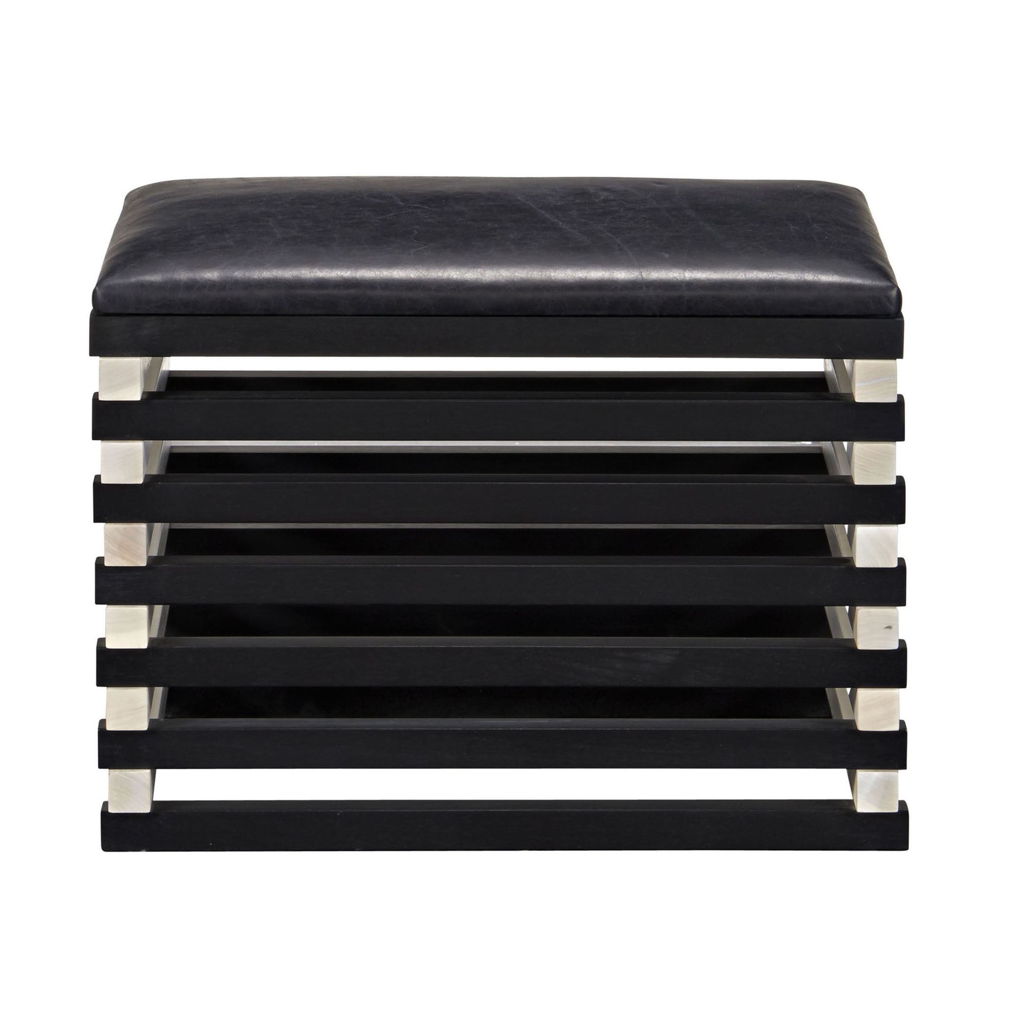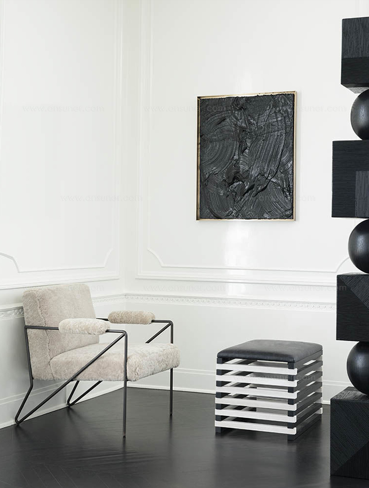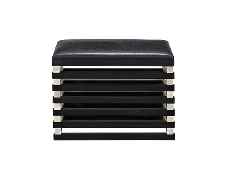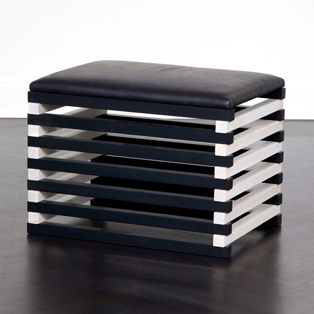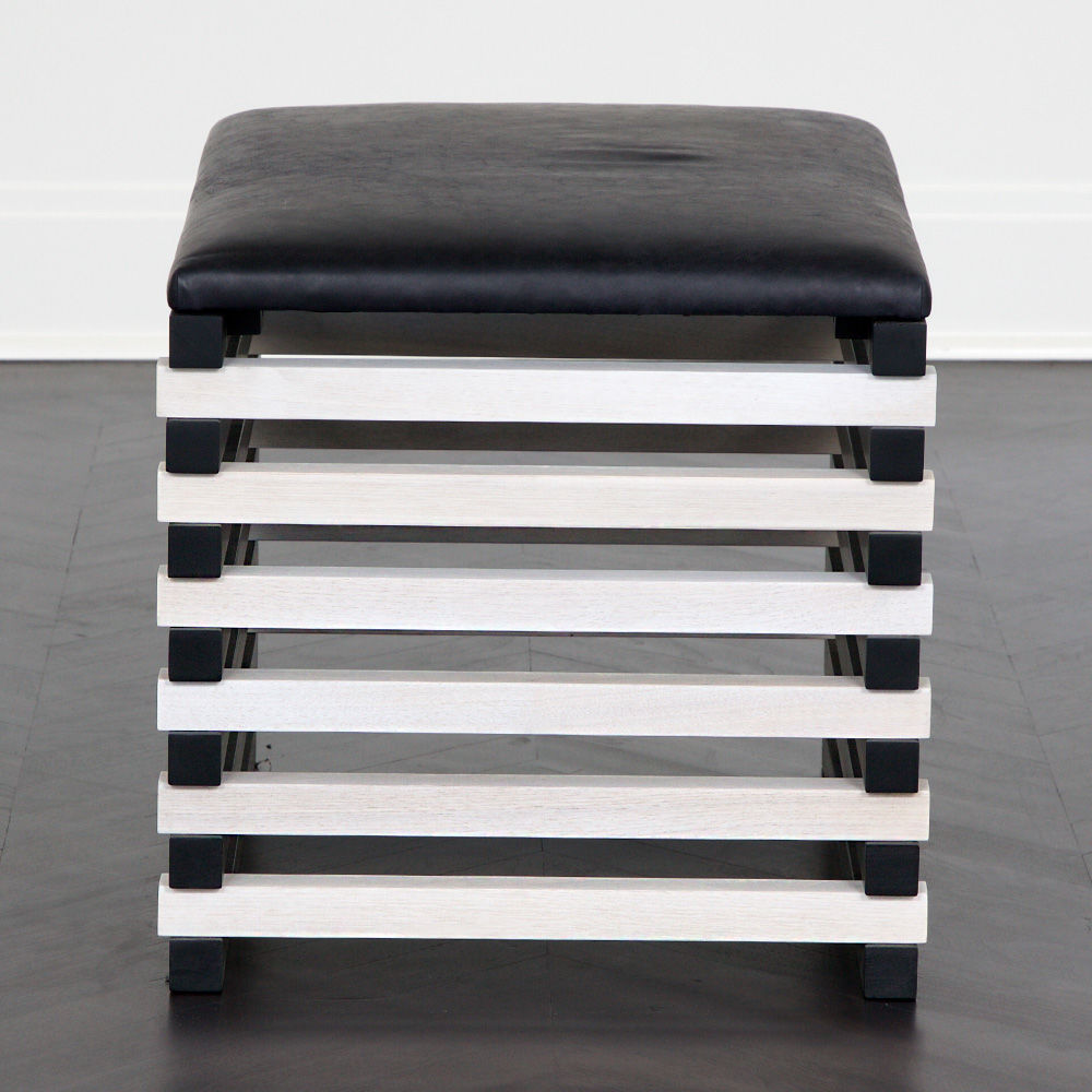 Hauser Ottoman的高对比度,交替的黑檀木和漂白胡桃木板条形成了现代,通风,雕塑般的外观,展示了纹理皮革定制的座垫。 这些凳子可以组合在一起形成一个休息区或矮桌。