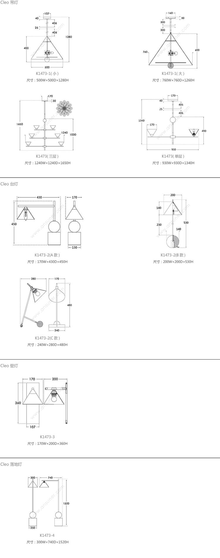 Cleo 吊灯 系列尺寸/示意图