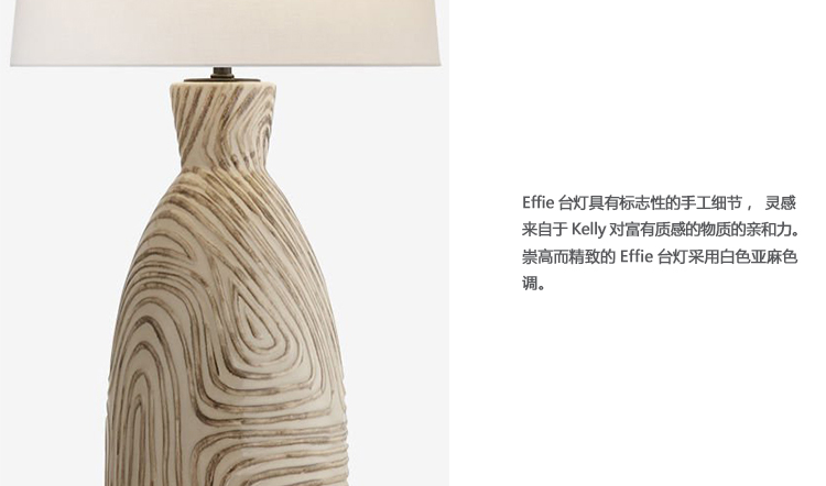 Effie台灯具有标志性的手工细节,灵感来自于Kelly对富有质感的物质的亲和力。 崇高而精致的Effie台灯采用白色亚麻色调。