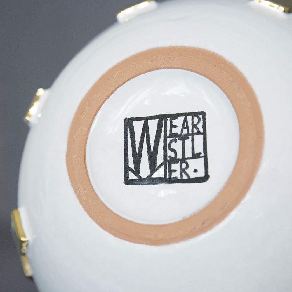 Chalet花瓶手工制作于意大利,配有22k金签名。 这款8英寸直径球形花瓶装饰有金色釉面瓷砖。 Chalet花瓶适合桌面使用,为任何房间增添功能性和魅力。