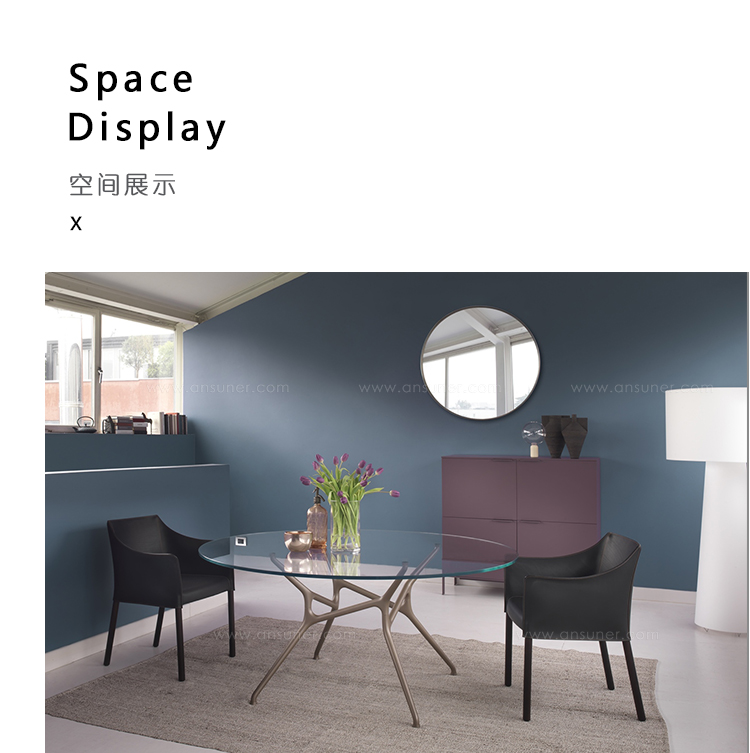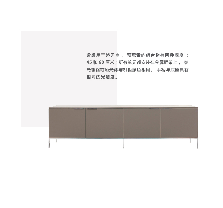 设想用于起居室,预配置的组合物有两种深度:45和60厘米; 所有单元都安装在金属框架上,抛光镀铬或哑光漆与机柜颜色相同。 手柄与底座具有相同的光洁度。