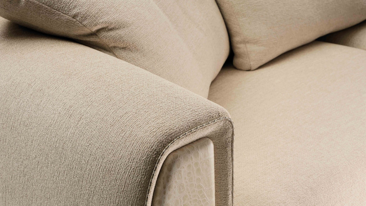Frontal cover available also in fabric or printed leather (see price for component on the price list). Fabric or leather piping on armrests
