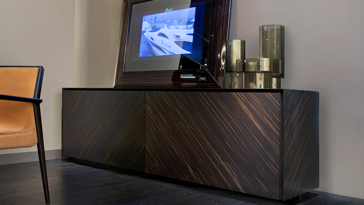 SHUTTERS Coplanar opening system, wood covered in Vermont leather or veneered Ebony Macassar with matt finishing