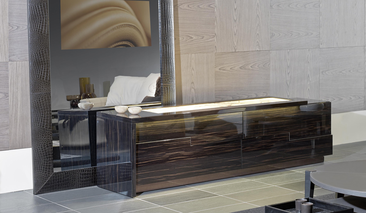 FRAME / SHUTTERS Wood veneered Ebony Macassar, Erable or lacquered with glossy lacquered brushed finishing. Wooden coplanar shutters coordinated with the frame