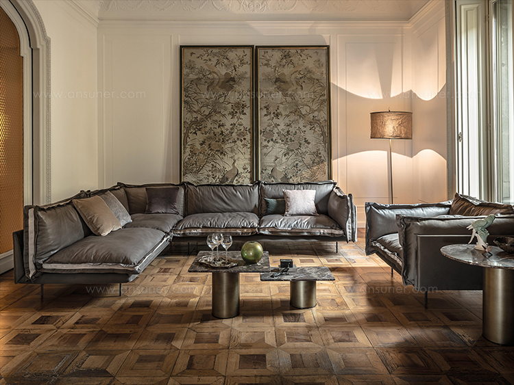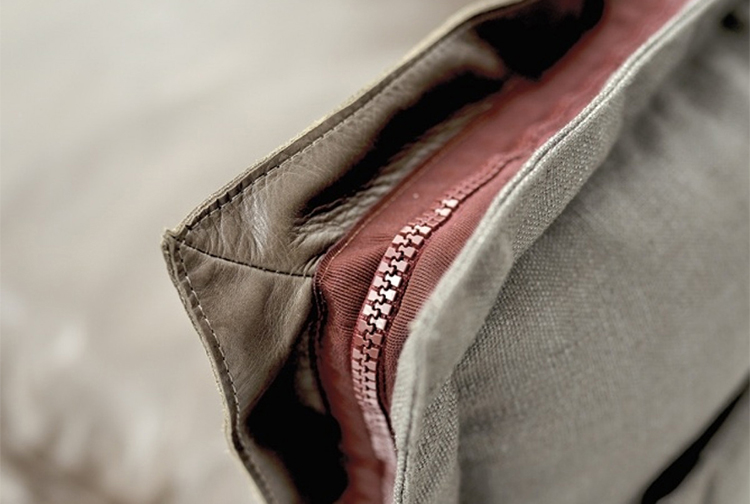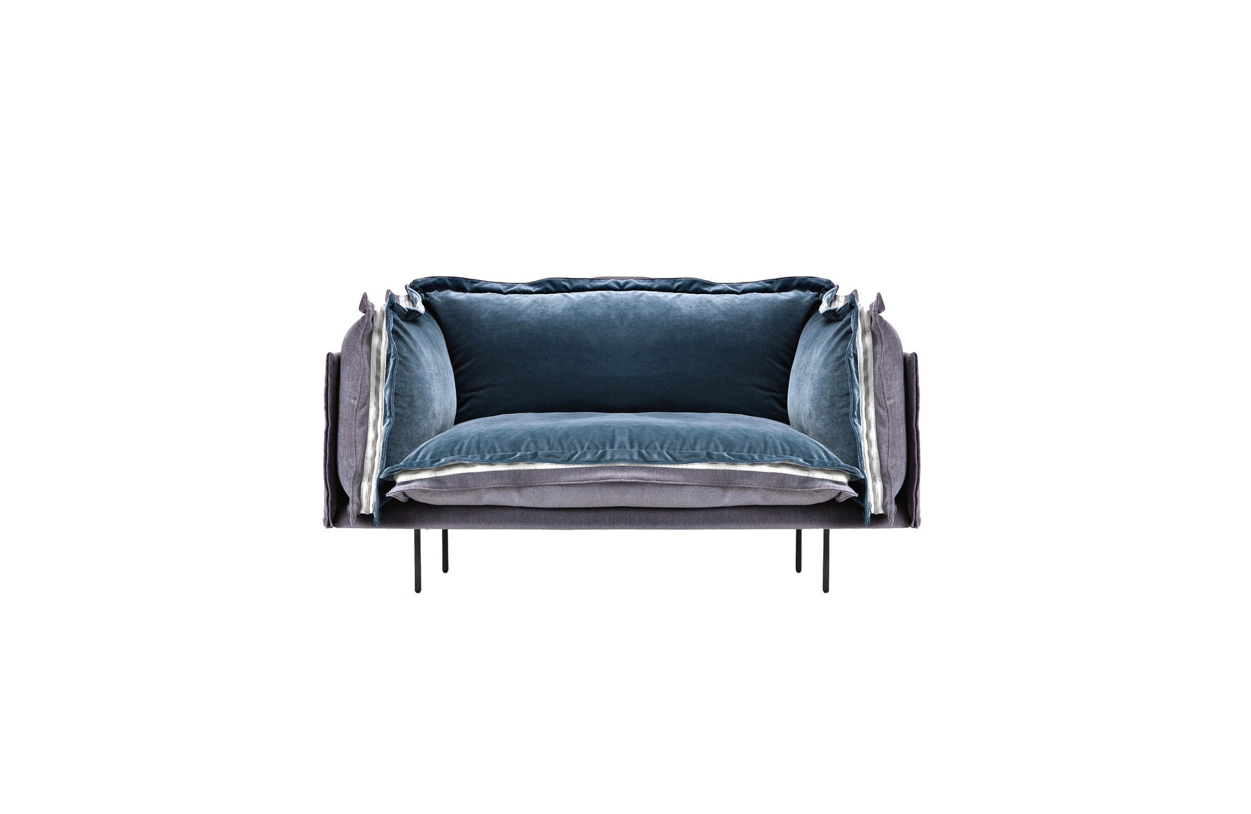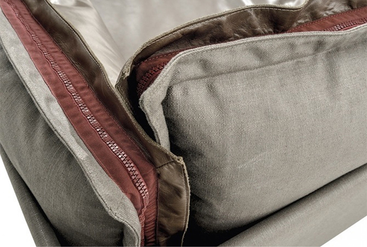The important zip, applied to the four sides of the cushions, fastens the two-sided cover, one in leather and one in fabric, gives rigour to the sofa and underlines its peculiar design. The result is a sofa in which the softness and warmth of the fabric coexists with the elegance of leather. A peculiar mix of materials to create different chromatic combinations and sophisticated matches. The structure seems to float above the ground thanks to the thin, minimal feet made of square section metal.