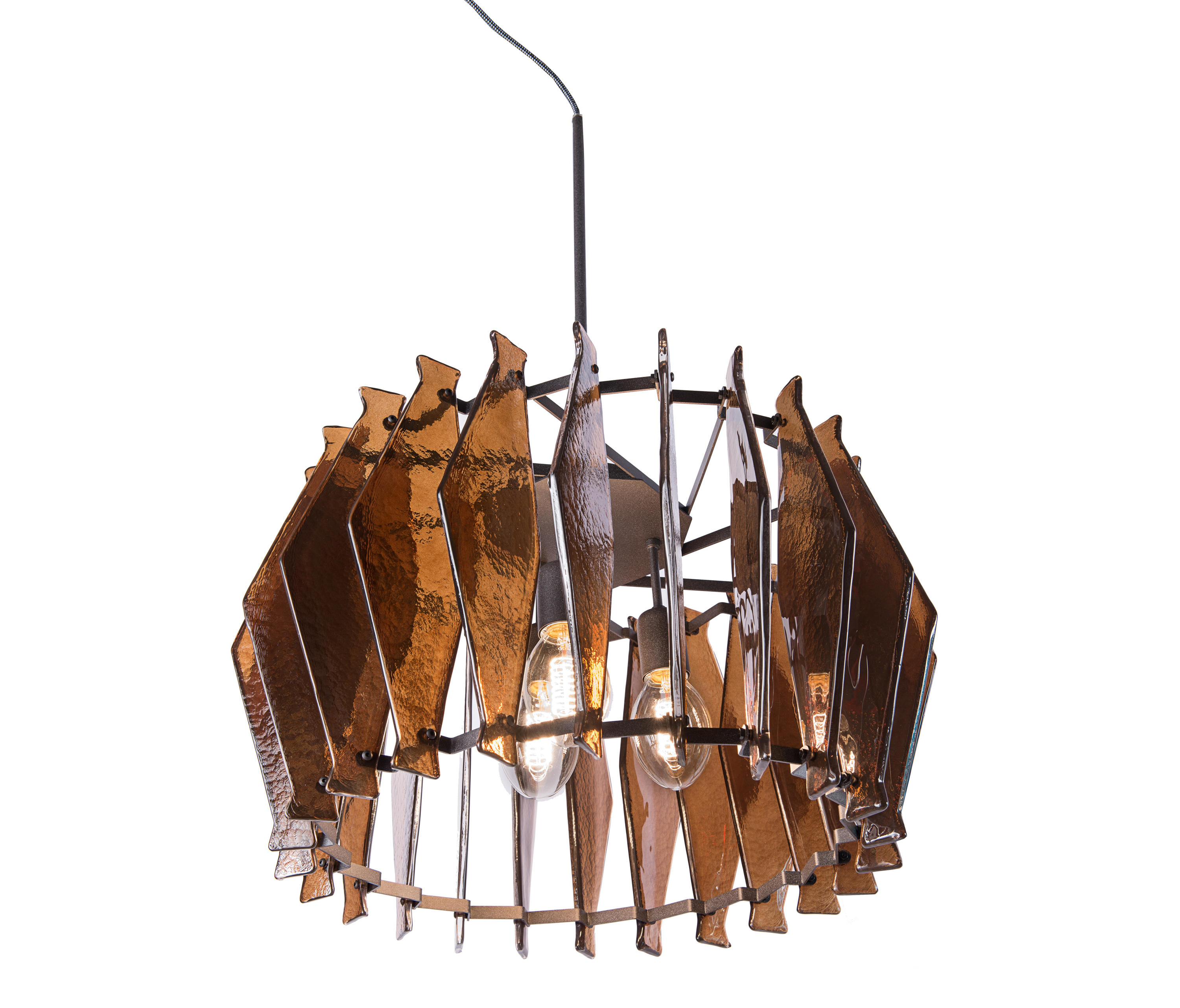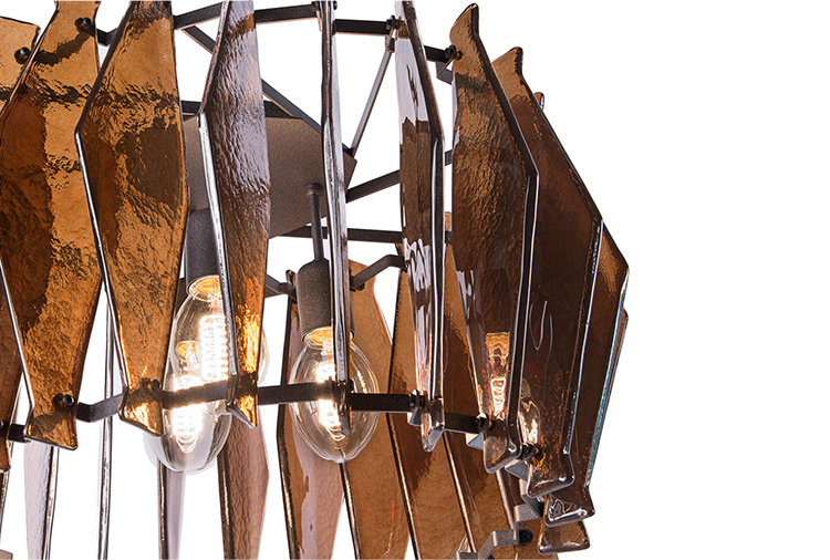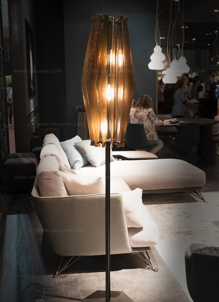 oompa-loompa灯的特点是有几条带着径向定位的带斑点的玻璃,就像许多小型的“oompa-loompas”正在跳舞一样。光线透过玻璃和空的空间扩散,创造出几束光线,营造出壮观的环境。该系列包括一个悬挂的版本,有青铜色、蓝绿色和红宝石色三种不同颜色;和一盏落地灯。金属部分是云母棕色的钛。