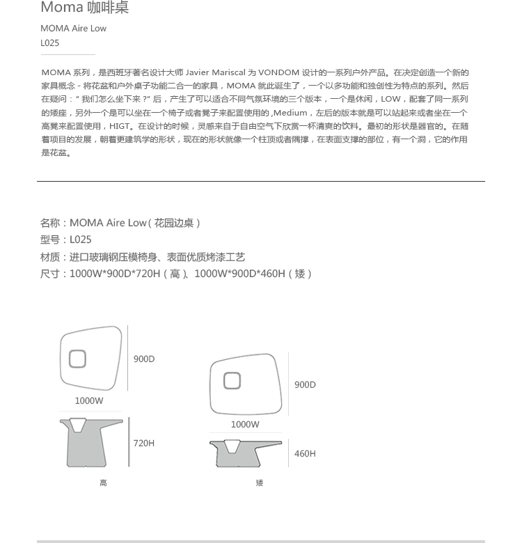 MOMA系列, 是西班牙著名设计大师Javier Mariscal 为VONDOM 设计的一系列户外产品。在决定创造一个新的家具概念-将花盆和户外桌子功能二合一的家具,MOMA就此诞生了,一个以多功能和独创性为特点的系列。然后在疑问:“我们怎么坐?”后,产生了可以适合不同气氛环境的三个版本,一个是休闲的,LOW,配套了同一系列的很舒适的矮座,另外一个是可以坐在一个椅子或者凳子来配置使用的,Medium ,左后的版本就是可以站起来或者坐在一个高凳来配置使用,HIGT。在设计的时候,灵感来自于自由空气下欣赏一杯清爽的饮料。最初的形状是器官的。在随着项目的发展,朝着更建筑学的形状,现在的形状就像一个柱顶或者隅撑,在表面支撑的部位,有一个洞,他的作用是花盆,一个带有VONDOM的自动淋水系统的花盆。其丰富鲜艳的色彩,令这个系列更新鲜,更个性。