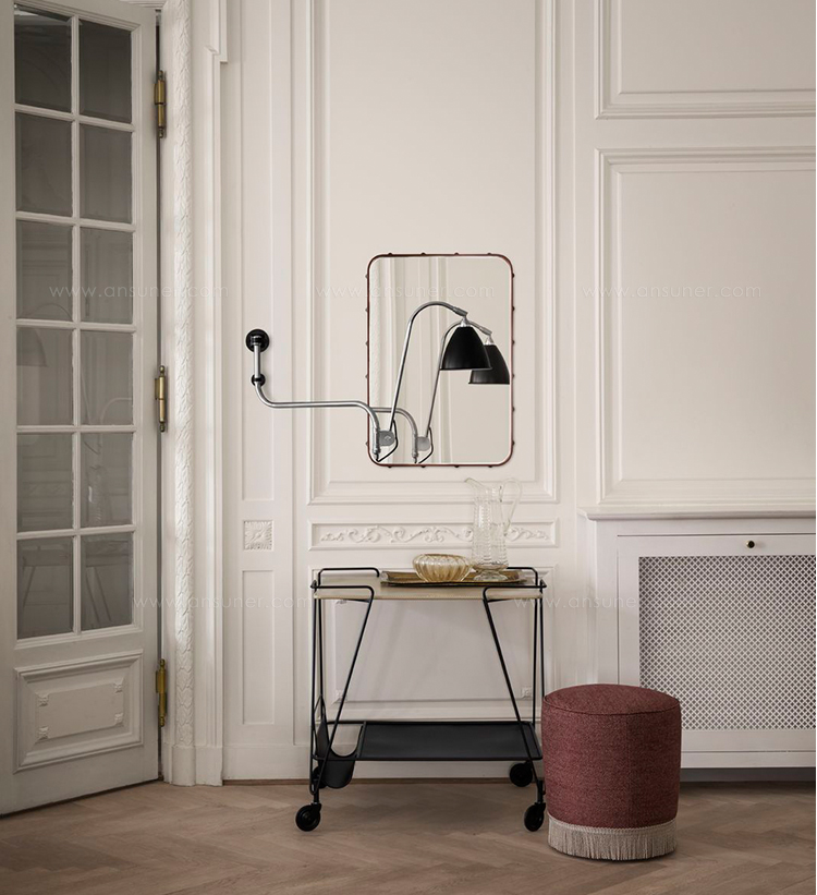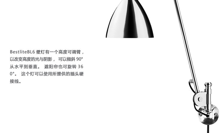 Bestlite BL6壁灯有一个高度可调臂,以改变高度的光与阴影,可以倾斜90°从水平到垂直。遮阳帘也可旋转360°。这个灯可以使用所提供的插头硬接线。
