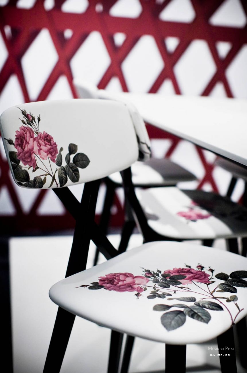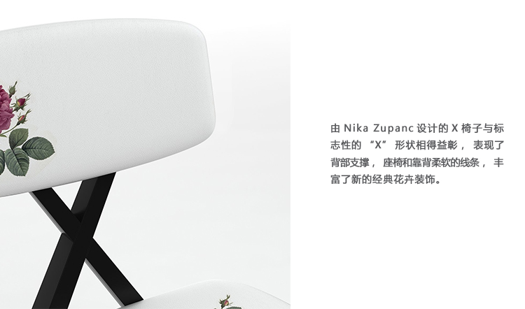 由Nika Zupanc设计的X椅子与标志性的“X”形状相得益彰,表现了背部支撑,座椅和靠背柔软的线条,丰富了新的经典花卉装饰。