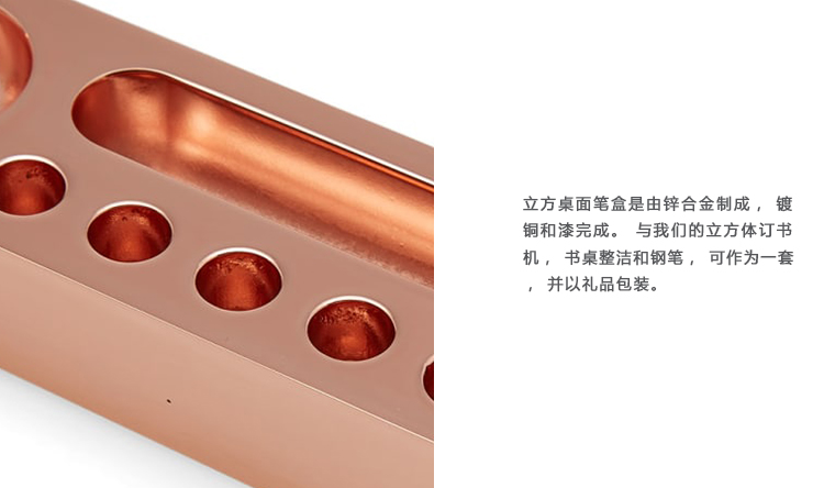 立方体桌面笔盒是由锌合金制成,镀铜和漆完成。与我们的立方体订书机,书桌整洁和钢笔,可作为一套,并以礼品包装。