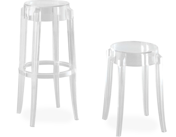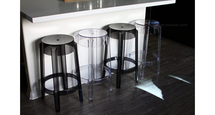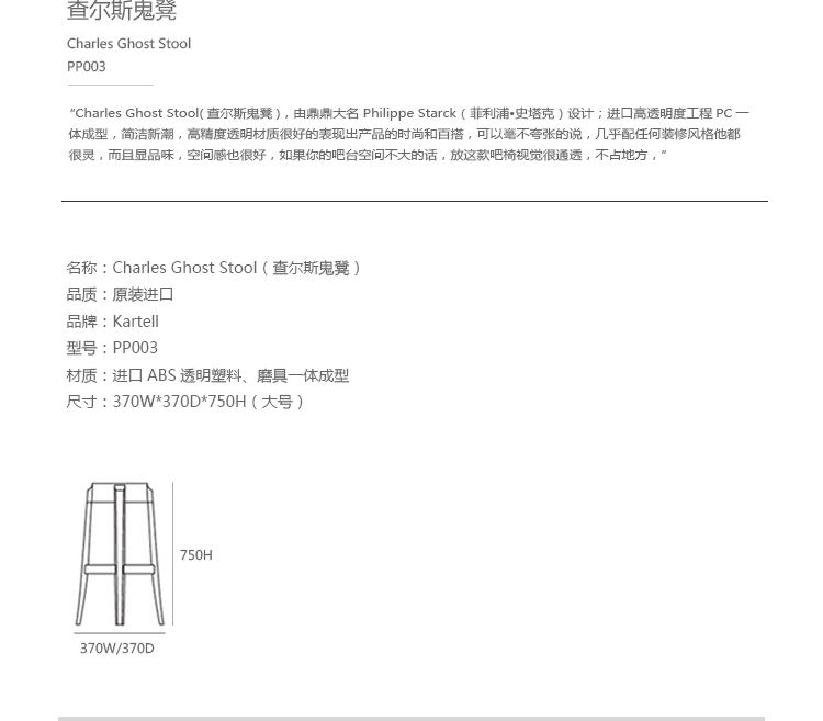 "Charles Ghost Stool(查尔斯鬼凳),由鼎鼎大名Philippe starck(菲利浦·史塔克)设计;进口高透明度工程塑料PC一体成型,简洁新潮,高净度透明材质很好的表现出产品的时尚和百搭,可以毫不夸张的说,几乎配任何装修风格他都很灵,而且显品味,空间感也很好,如果你的吧台空间不大的话,放这款吧椅视觉很通透,不占地方。"