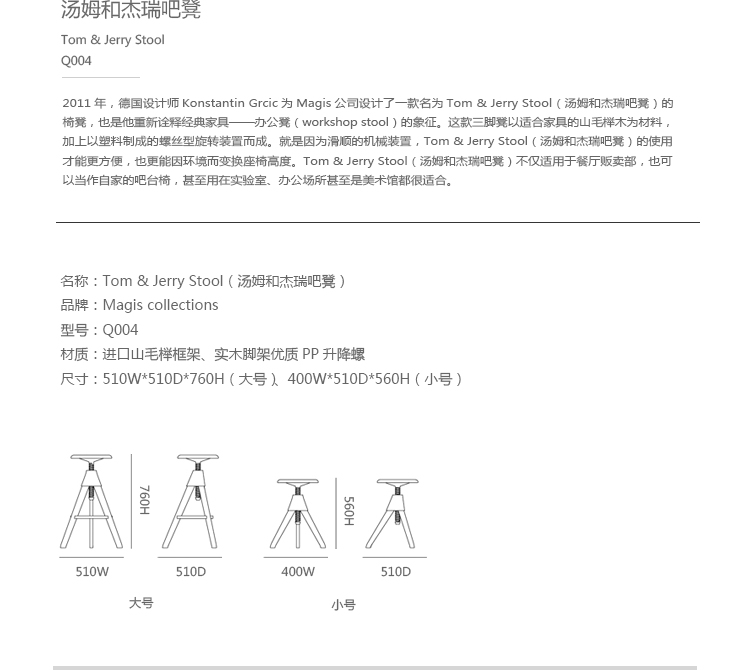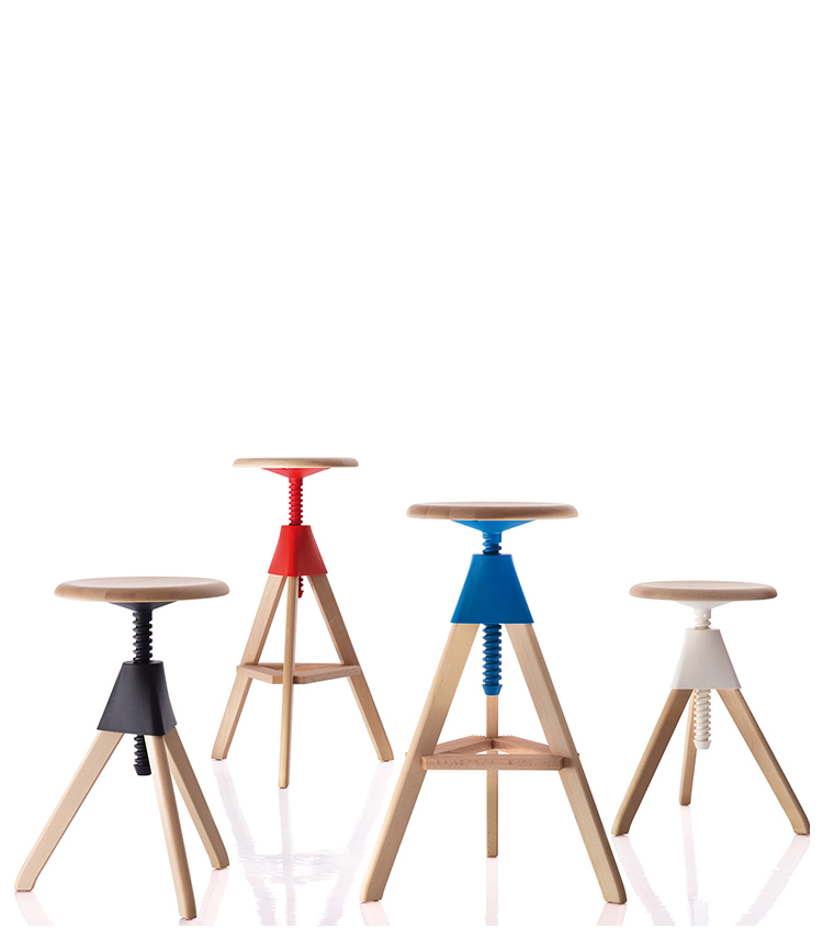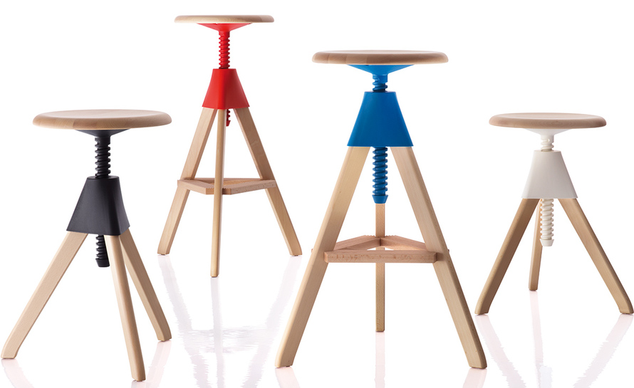 2011年,德国设计师Konstantin Grcic为Magis公司设计一款名为Tom & Jerry Stool(汤姆和杰瑞吧凳)的椅凳,也是他重新诠释经典家具──办公凳(workshop stool)的象征。这款三脚凳以适合制作家具的山毛榉木为材料,加上以塑料制成的螺丝型旋转装置而成。 就是因为滑顺的机械装置,Tom & Jerry Stool(汤姆和杰瑞吧凳)的使用才能更方便,也更能因环境而变换座椅高度。Tom & Jerry Stool(汤姆和杰瑞吧凳)不仅适用于餐厅贩卖部,也可以当作自家的吧台椅,甚至用在实验室、办公场所甚至是美术馆都很适合。