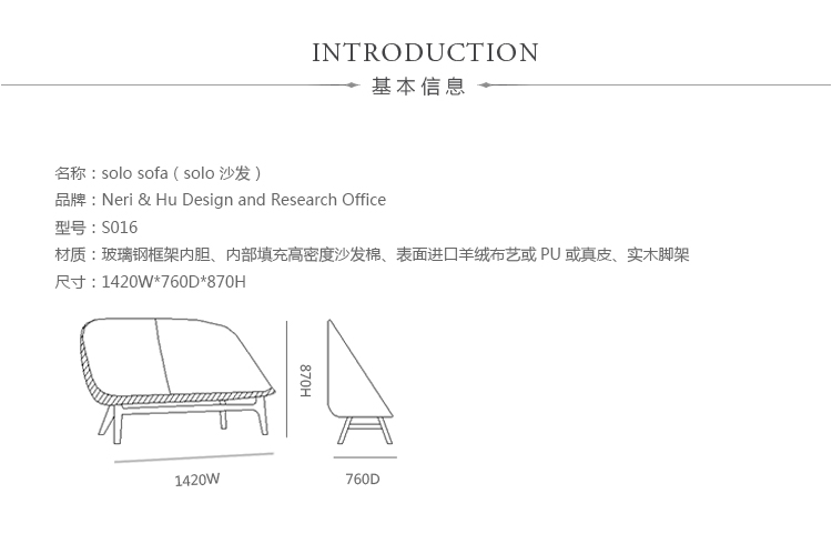 由郭锡恩先生和胡如珊女士于2004年共同创立的如恩设计研究室(Neri&Hu),是一家立足于中国上海的多元化建筑设计研究室。如恩设计提供国际化的建筑、室内、整体规划、平面以及产品设计服务。公司目前的项目分布在很多不同的国家,拥有来自全世界各地的员工,使用超过30种语言。郭锡恩先生和胡如珊女士的如恩设计室设计,并由De La Espada公司为其自有品牌制作的solo sofa(solo 沙发)线形简单流畅,外型以简约细腻的北欧设计为方向,视觉比例的层迭丰富,融合义式沙发中柔软舒适的元素,靠垫内衬高密度泡棉,兼具支撑性与松软度。制作采用玻璃钢框架内胆、内部填充高密度沙发棉、表面进口羊绒布艺或PU或真皮、实木脚架。