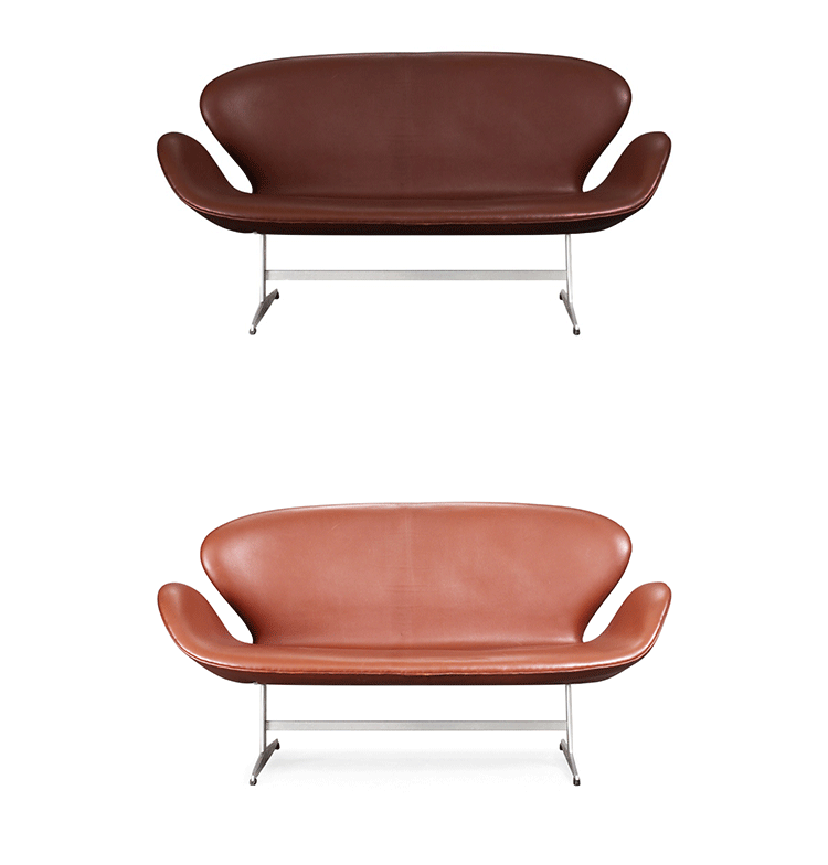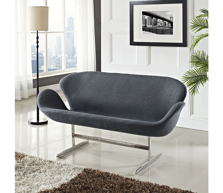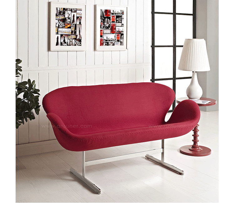 1958 年,Arne Jacobsen为哥本哈根皇家大酒店21楼房间的套房、 休息室和全景房设计的这套Swan Sofa(天鹅沙发)。天鹅沙发是两个坐席版本的天鹅椅,这个优雅的沙发设置在铝振动筛脚架上。优雅的和有机的形状非常适合休息室和等候区,以及家庭。雅各布森作为一个著名建筑师,同时也是一位非常成功的工业设计师,他为丹麦著名的FH家具公司〔FritzHansen〕设计了一系列座具家具,都成为市场欢迎的畅销产品。他的家具设计作品都是享誉国际的经典设计,天鹅椅就是其中之一;他将自由流畅的雕刻式塑形,以及北欧设计的传统特质相结合,使其作品具有质感非凡与结构完整的特点。天鹅椅制作采用玻璃钢框架内胆、内部填充高密度沙发棉、表面扪高级进口羊绒布料或PU或真皮、铝合金脚架(可振动)。